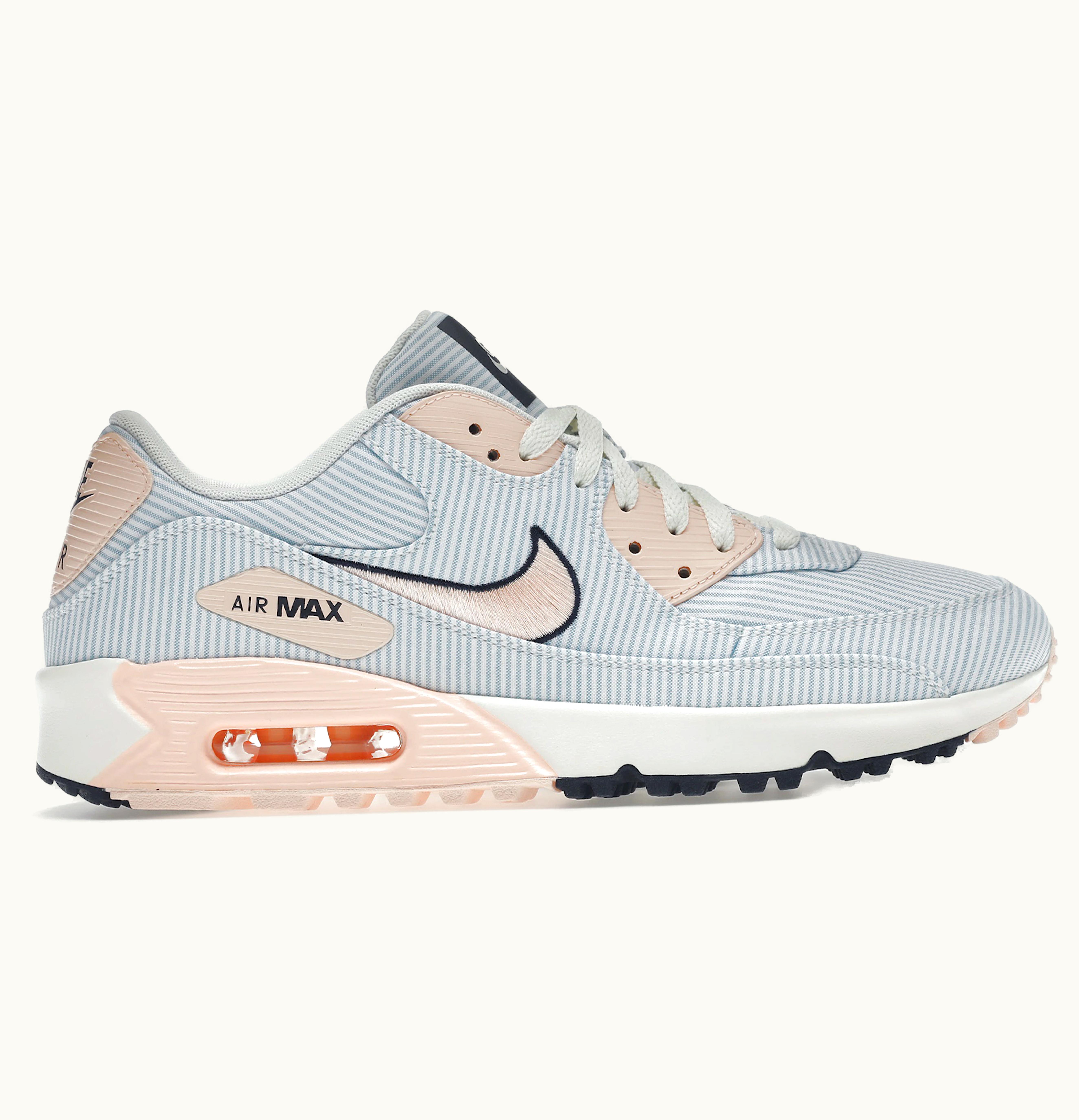 The Nike Air Max 90 Golf NRG Seersucker is a stylish and comfortable golf shoe designed for ultimate performance on the course. Featuring a classic seersucker fabric upper in blue and white stripes, this shoe adds a touch of vintage sophistication to your golf attire. The Air Max unit in the heel delivers optimal cushioning, while the foam midsole provides lightweight support and comfort during every swing. The outsole features integrated traction to keep you stable and steady on any terrain, helping you to play your best game. With its unique design and superior construction, the Nike Air Max 90 Golf NRG Seersucker is the perfect choice for golfers who want to look and feel their best on the course.