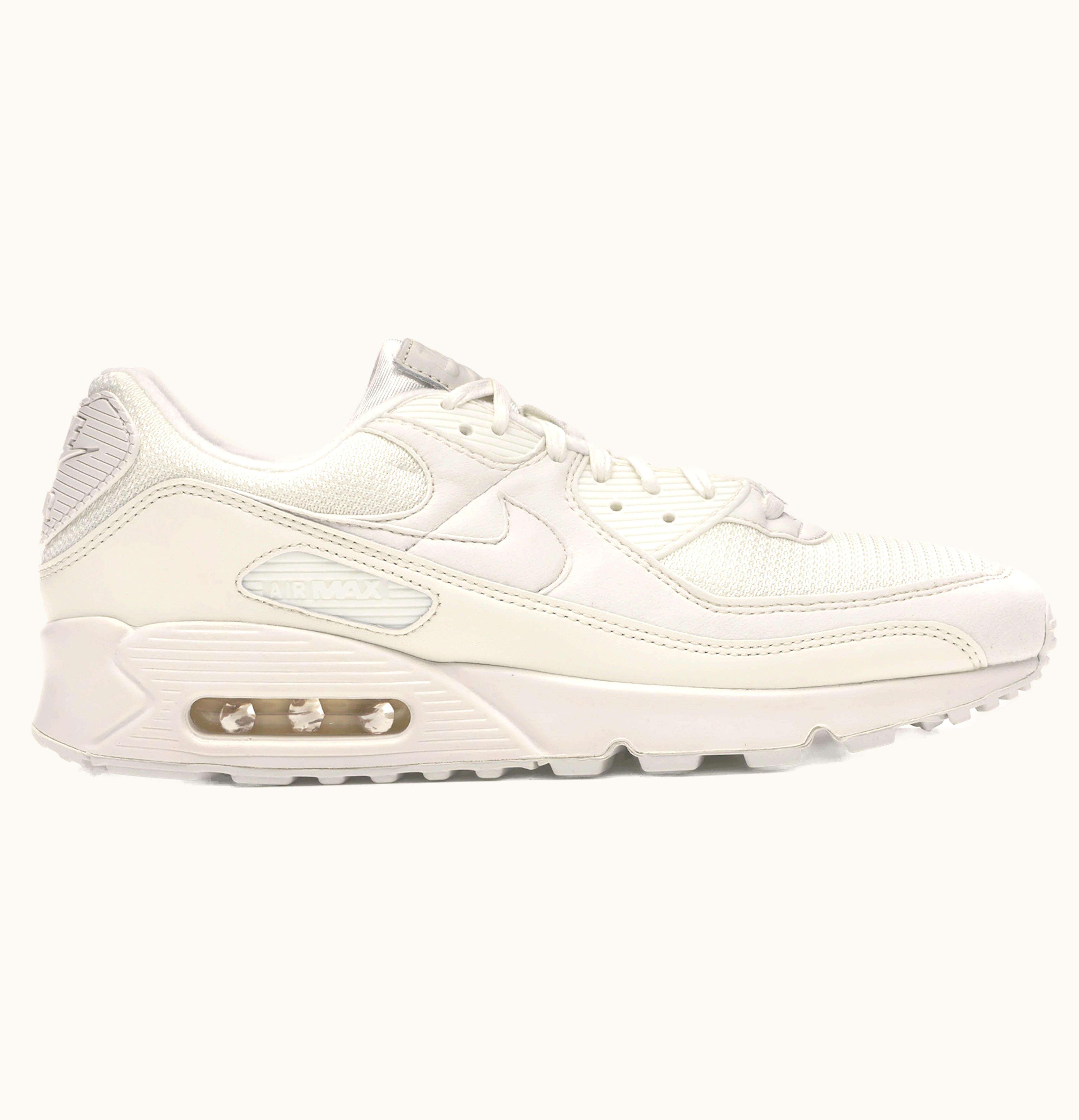 The Nike Air Max 90 Recraft Sail is a modern shoe that pays homage to the original design of the iconic Air Max 90. It features a clean white and sail colorway with black accents, giving it a classic and versatile look. The upper is made of premium leather and mesh, providing durability and breathability. The shoe has a padded collar and tongue for added comfort, and a foam midsole with the signature Max Air unit in the heel for cushioning and impact protection. The outsole is made of durable rubber with a waffle pattern for traction and durability. The Air Max 90 Recraft Sail is a perfect combination of style, comfort, and performance, making it a great choice for everyday wear or athletic activities.