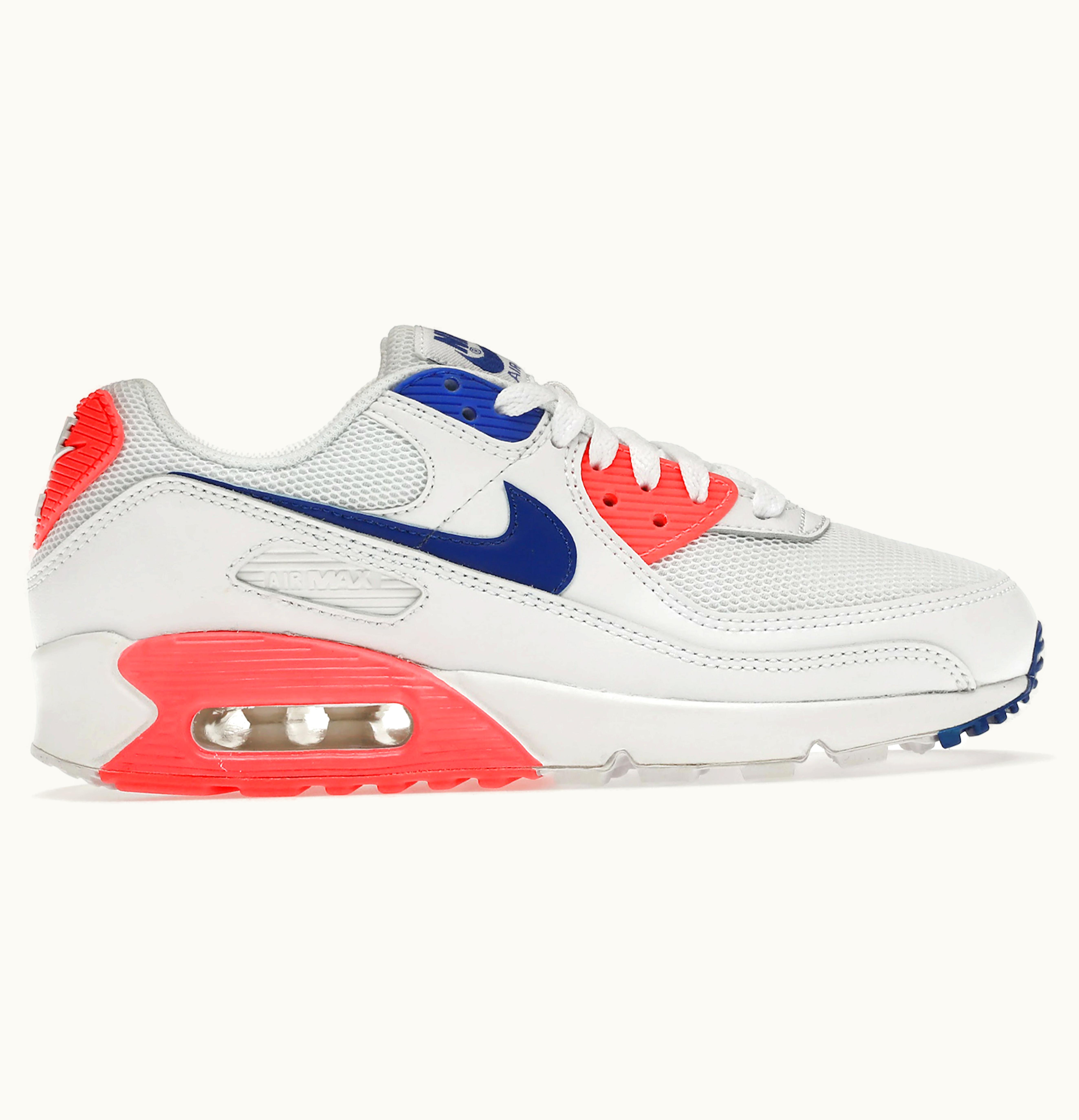 The Nike Air Max 90 Ultramarine (2020) (W) is a trendy and sporty women's sneaker that offers unbeatable comfort and support. This shoe is designed with a white leather upper, complemented by vibrant Ultramarine and Solar Red detailing that creates a bold and stylish look. The iconic Air Max unit is visible in the heel of the shoe, providing responsive cushioning and shock absorption with every step. Additionally, the shoe features a padded collar and foam midsole, ensuring maximum comfort for all-day wear. The Nike Air Max 90 Ultramarine (2020) (W) is complete with a rubber outsole that offers excellent traction and durability, making it ideal for all kinds of activities. Whether you're hitting the gym, going for a run, or just running errands around town, these shoes are sure to keep you comfortable and stylish.