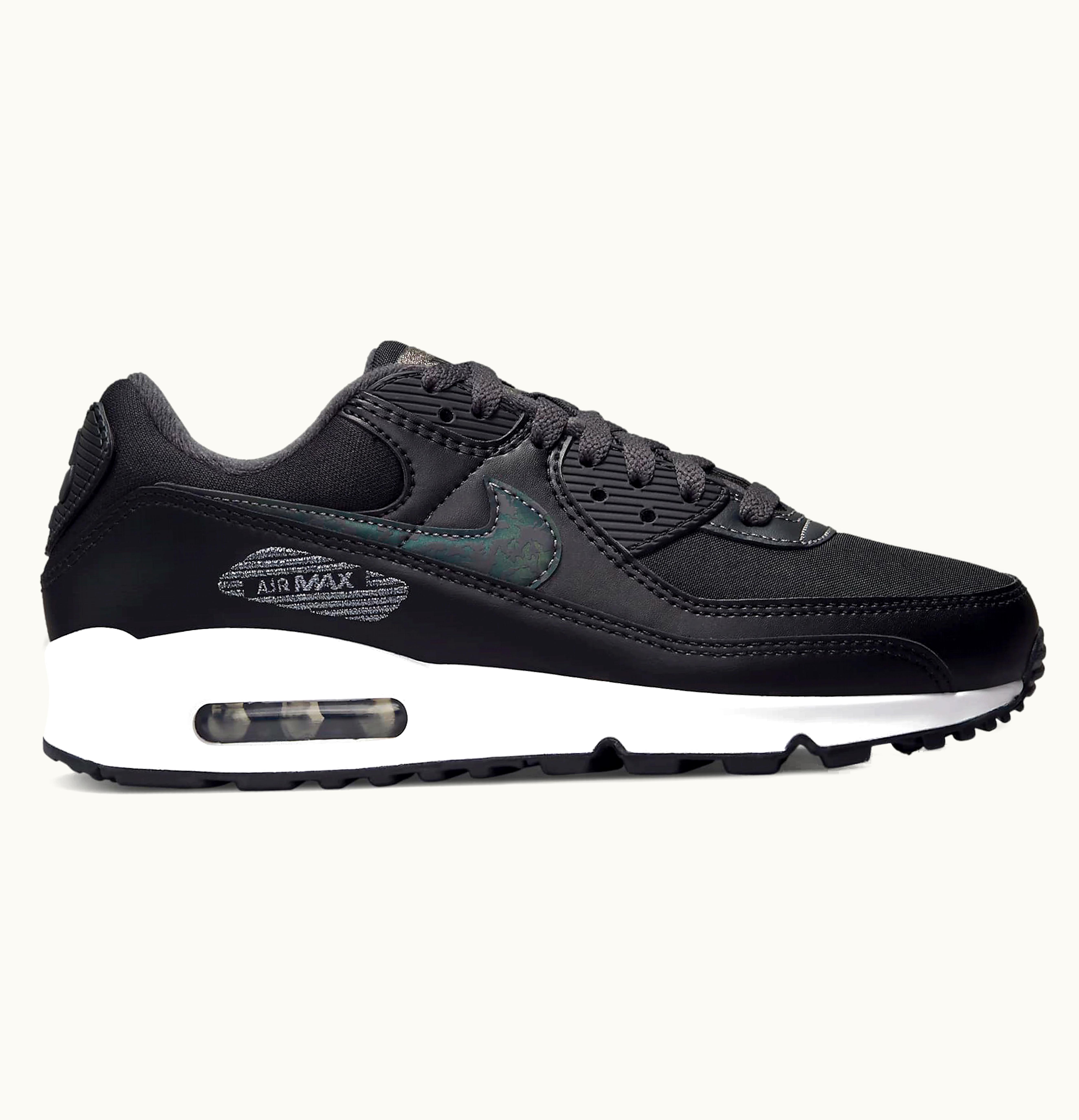 The Nike Air Max 90 Black Metallic Silver (W) is the perfect addition to any street-style enthusiast's wardrobe. This iconic sneaker boasts a black leather upper with sleek metallic silver accents throughout, including on the Nike Swoosh branding on the side panels, eyelets, and heel tab. The midsole features visible Air-Sole units in the heel and forefoot for ultimate cushioning and support. The outsole is made of a durable rubber material, ensuring sure-footedness on all surfaces. The Nike Air Max 90 Black Metallic Silver (W) is completed with a padded collar and tongue for comfort during extended wear, making them the perfect shoe for anyone looking for a balance of fashion, comfort, and performance.