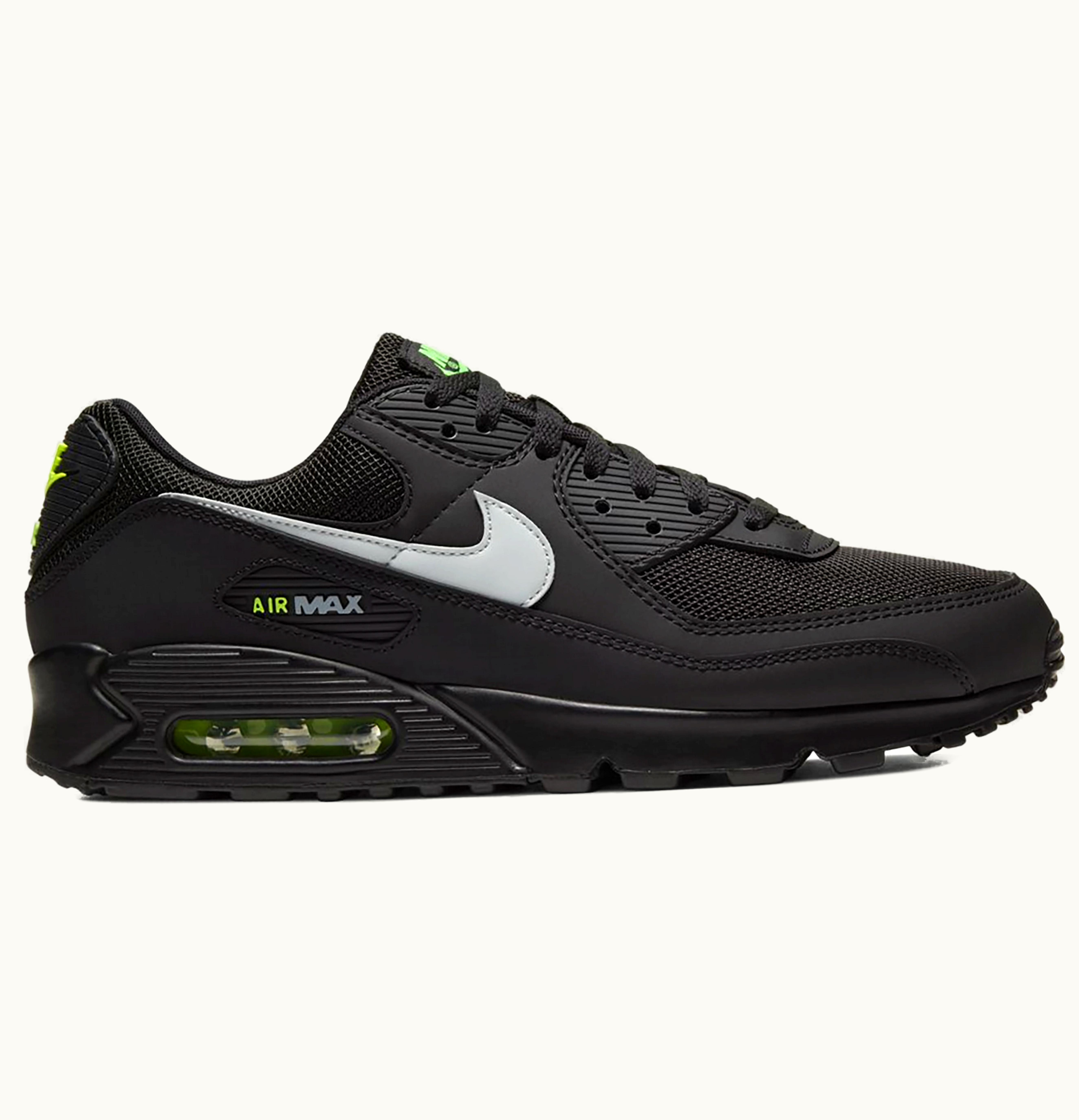 The Nike Air Max 90 Black Volt Light Smoke Grey is a stylish and comfortable sneaker that is perfect for everyday wear. The upper is made from a combination of leather, suede, and mesh, which provides both durability and breathability. The black and light smoke grey colorway is accented with vibrant volt accents throughout, including on the Nike swoosh and Air Max branding. The shoe features a comfortable and supportive foam midsole, which is enhanced by a visible Max Air unit in the heel. This provides excellent cushioning and shock absorption, making the shoe perfect for running, exercising, or just walking around town. Additionally, the shoe has a rubber outsole with a waffle pattern, which provides excellent traction and durability. Overall, the Nike Air Max 90 Black Volt Light Smoke Grey is a stylish and functional sneaker that is perfect for anyone looking for a comfortable and fashionable daily shoe.