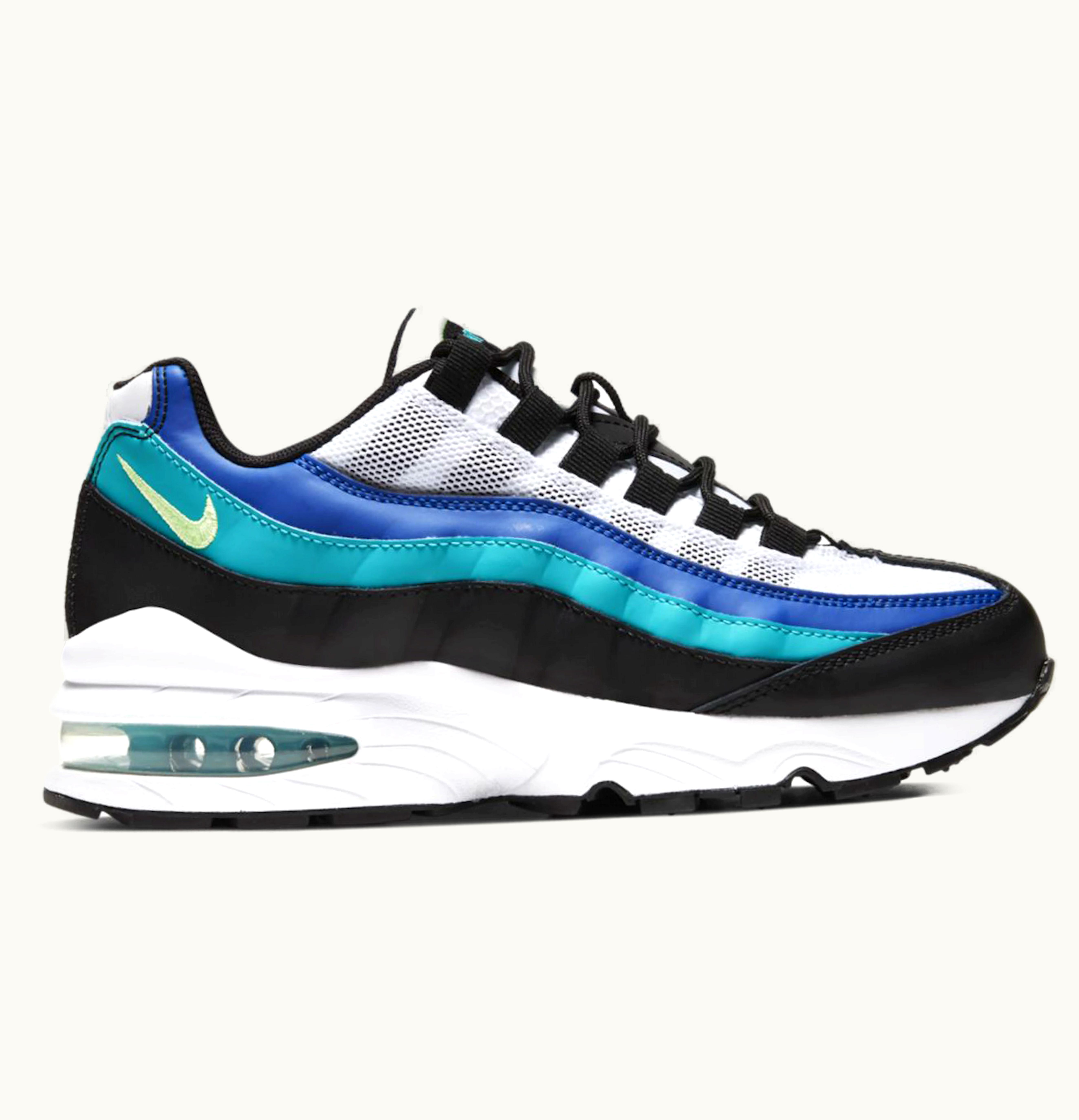 The Nike Air Max 95 Black Oracle Aqua (GS) is a high-quality, stylish and comfortable sneaker designed specifically for young athletes. It features a black and white design with eye-catching teal accents that create a bold, eye-catching look. The upper of the shoe is constructed of durable leather and synthetic materials, while the full-length Air-Sole technology provides superior cushioning, shock absorption, and support for the feet. The rubber outsole provides excellent traction on a variety of surfaces, making this shoe ideal for both indoor and outdoor activities. Whether running, jumping, or simply walking around, the Nike Air Max 95 Black Oracle Aqua (GS) offers exceptional comfort, style, and performance for young athletes who demand the very best from their footwear.