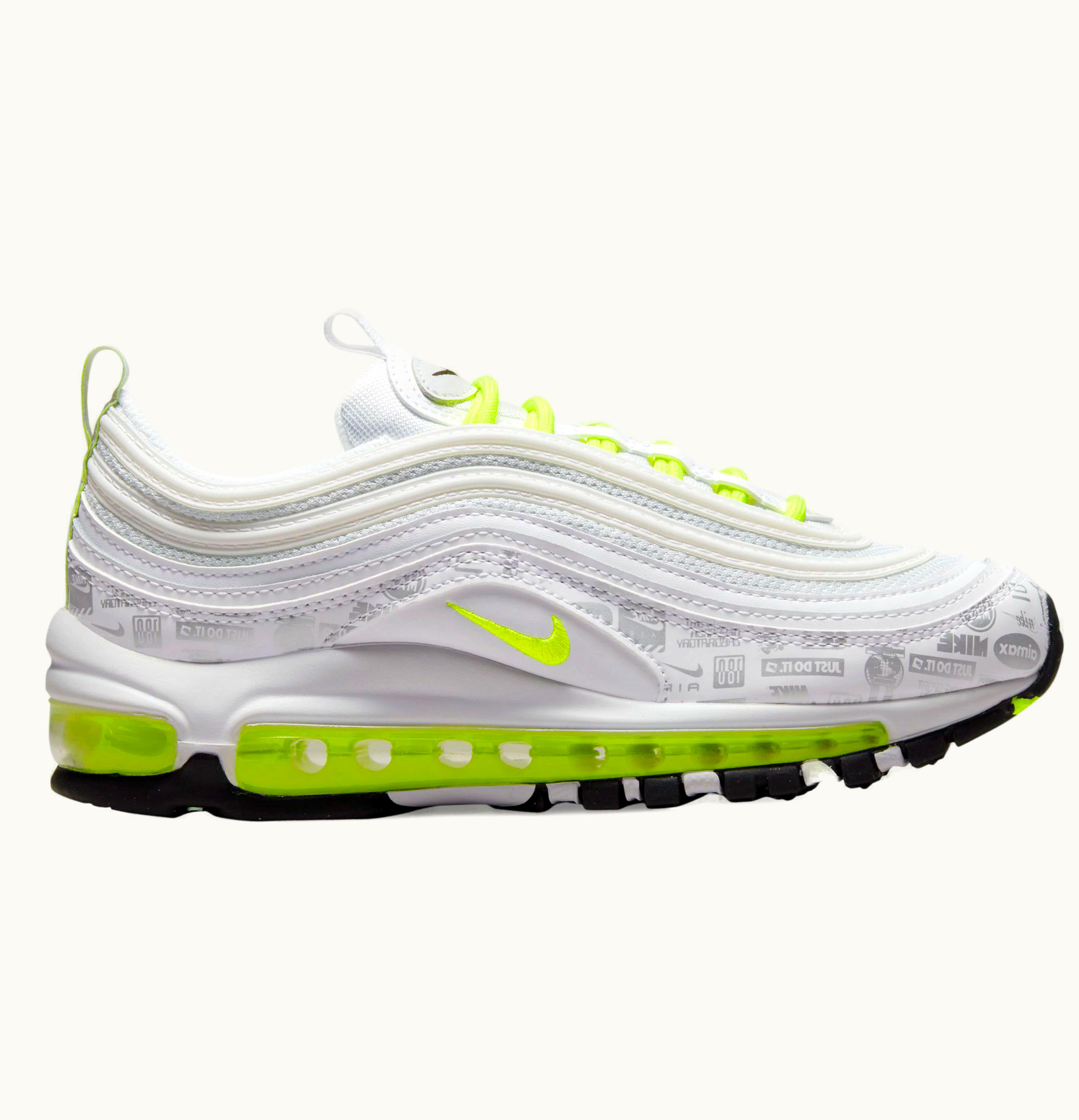 The Nike Air Max 97 Just Do It White Volt (GS) is a stylish and comfortable shoe designed for kids. It features a sleek white upper with bold black "Just Do It" text and volt green accents throughout. The classic Air Max 97 silhouette provides excellent support and cushioning, while the rubber outsole delivers durable traction. With its striking design and functional features, this shoe is perfect for everyday wear and athletic activities alike.