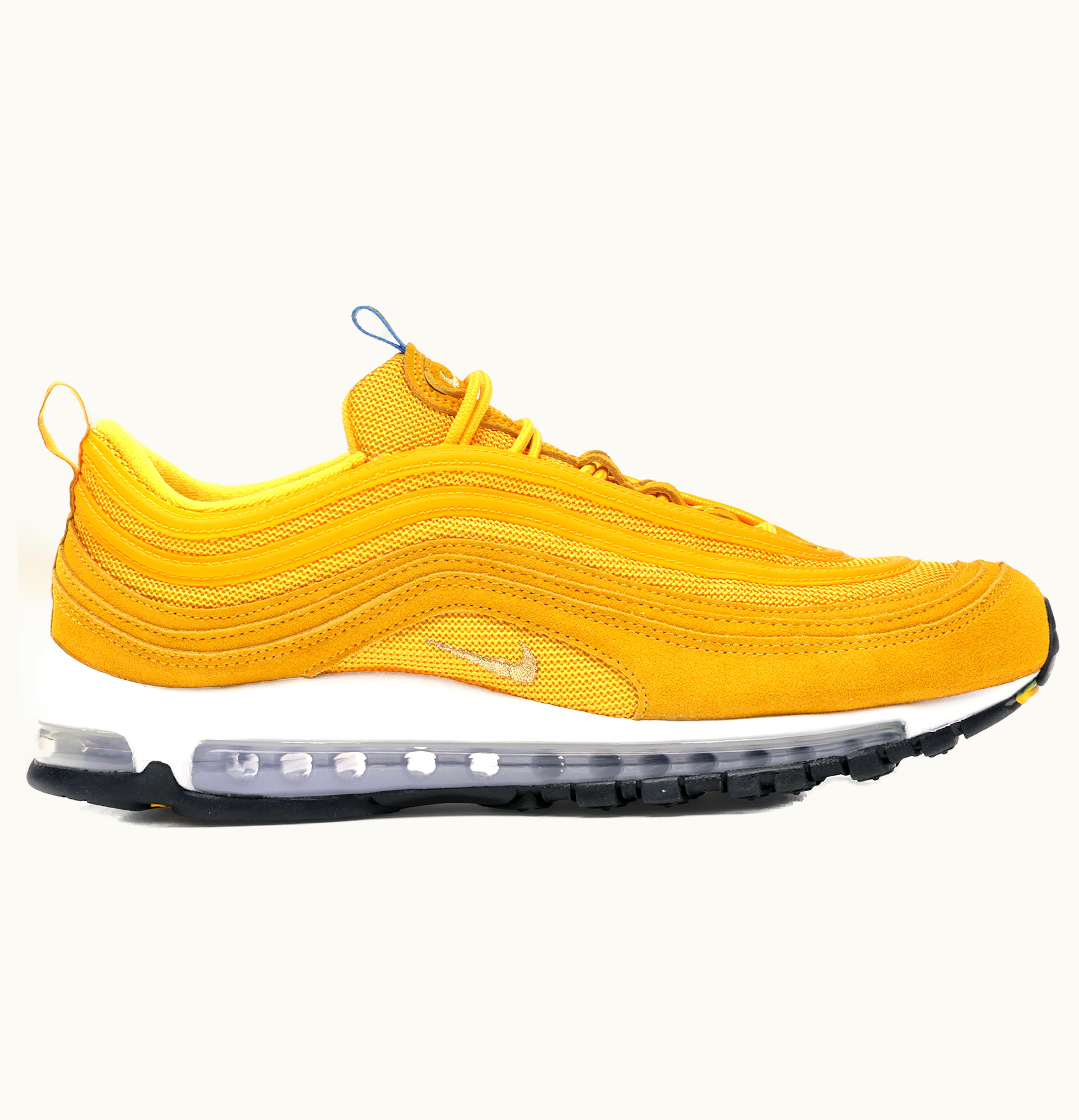 The Nike Air Max 97 Olympic Rings Pack Yellow is a limited edition sneaker inspired by the iconic Olympic rings. The shoe features a vibrant yellow upper with contrasting black and white stripes on the sides. The iconic swoosh logo is embroidered in black on the side of the shoe, while the Olympic rings are featured on the tongue and heel tab. The shoe sits atop a white midsole that houses Nike's signature Air Max technology providing cushioning and comfort for every step. The outsole is made of durable rubber, ensuring both stability and traction. With its unique design and bold colorway, the Nike Air Max 97 Olympic Rings Pack Yellow is a must-have for sneaker enthusiasts and Olympic fans alike.