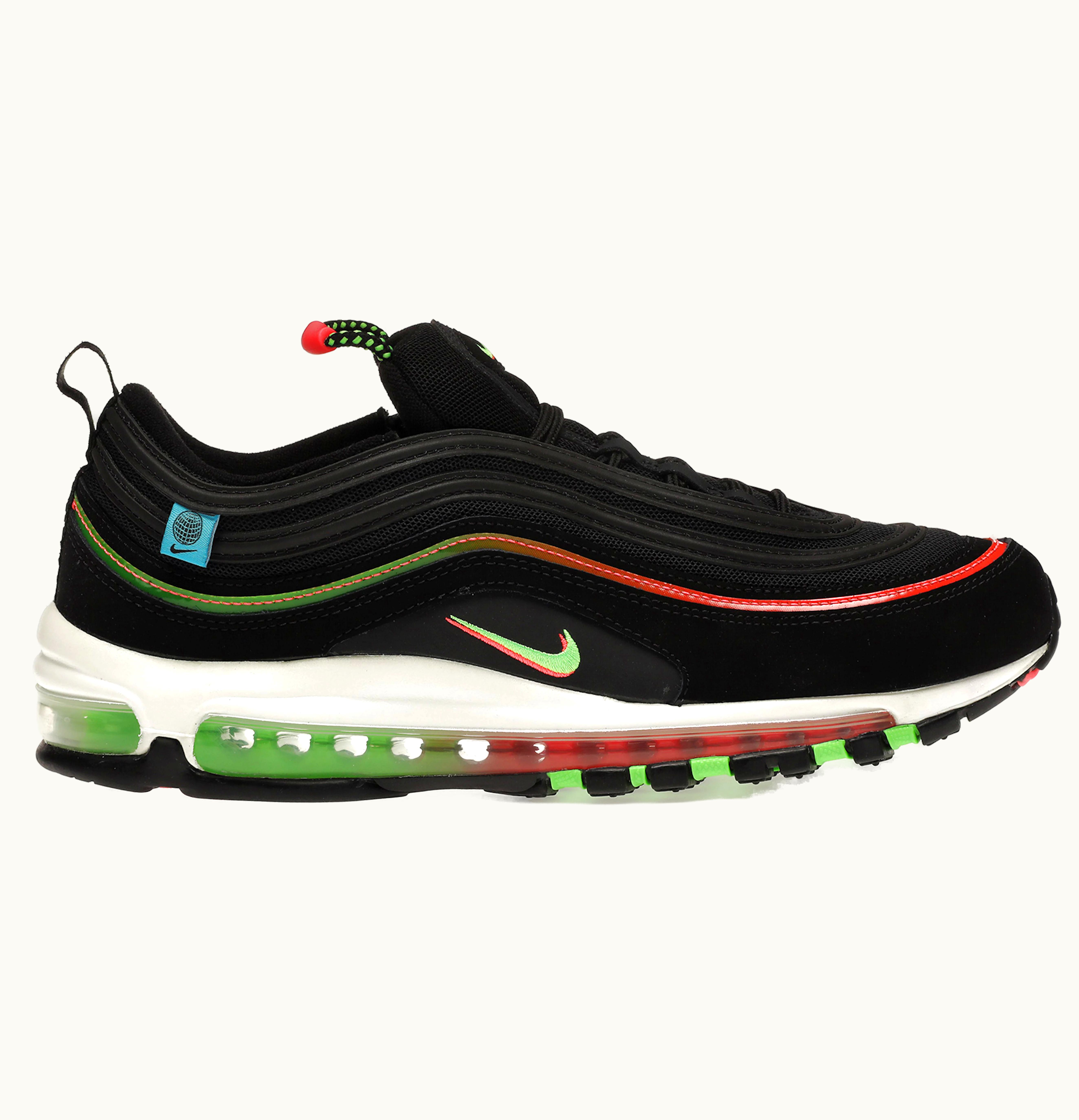 The Nike Air Max 97 Worldwide Black is a premium sneaker that showcases a sleek and stylish design with a predominantly black colorway. It features a synthetic leather and mesh upper, offering both durability and breathability. The iconic wavy design is covered in various colorful accents and graphics, representing different countries around the world. The full-length visible Air Max unit ensures maximum cushioning and comfort, perfect for everyday wear, and the rubber outsole provides excellent traction and durability. With its unique, multicultural design and superior comfort, the Nike Air Max 97 Worldwide Black is a must-have for sneakerheads and fashion enthusiasts alike.