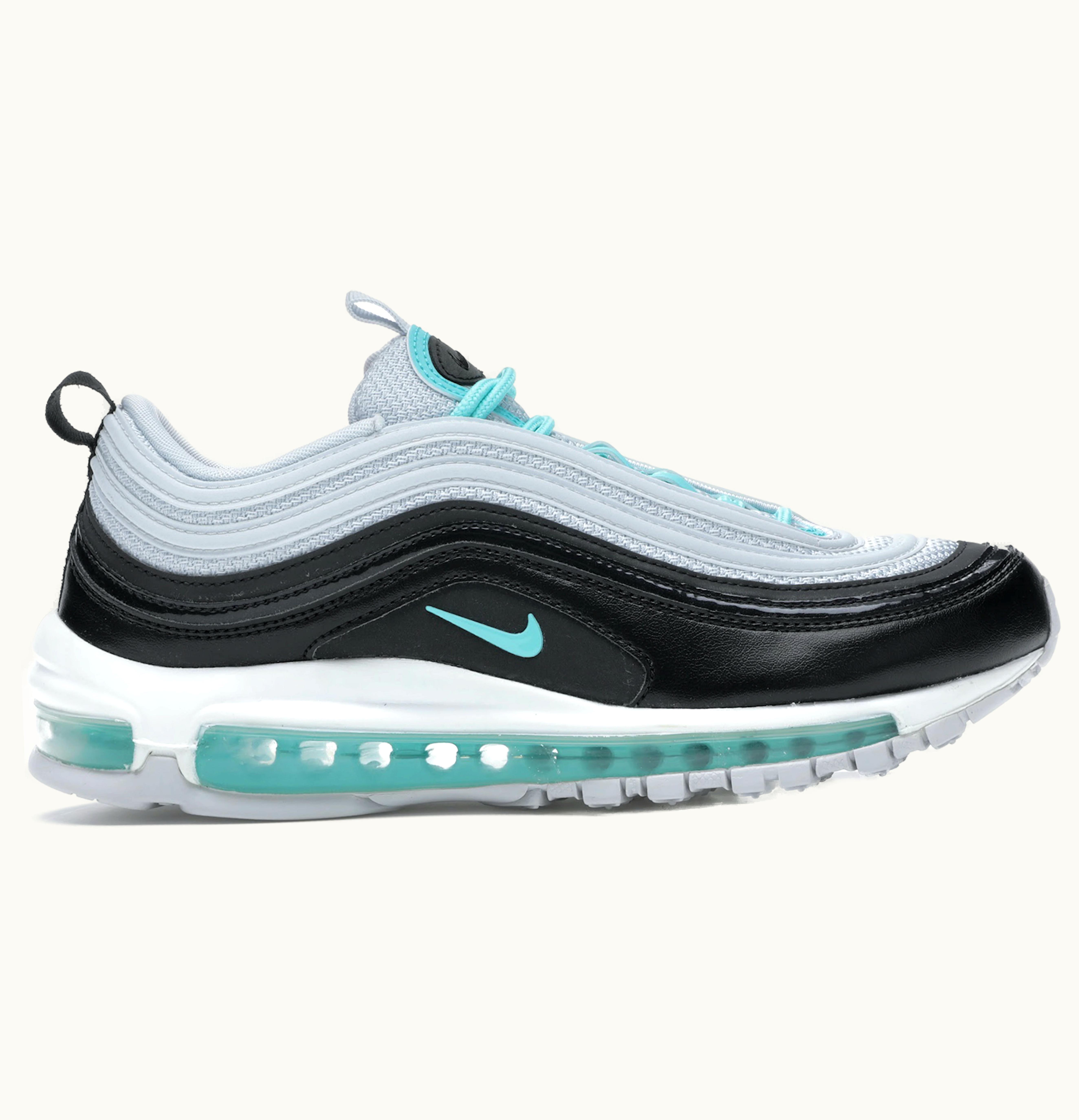 The Nike Air Max 97 Platinum Black Aurora Green (W) is a pair of women's sneakers that combines sleek style with high-performance features. The upper is composed of a clean, platinum silver color with black accents, creating a cool and sophisticated look. The Aurora Green wave pattern along the sides adds a fun pop of color to the shoe. The Air Max 97's signature full-length Max Air unit offers responsive cushioning, while the rubber outsole provides traction and durability. With its comfortable fit and eye-catching design, this shoe is perfect for both casual wear and athletic activities.
