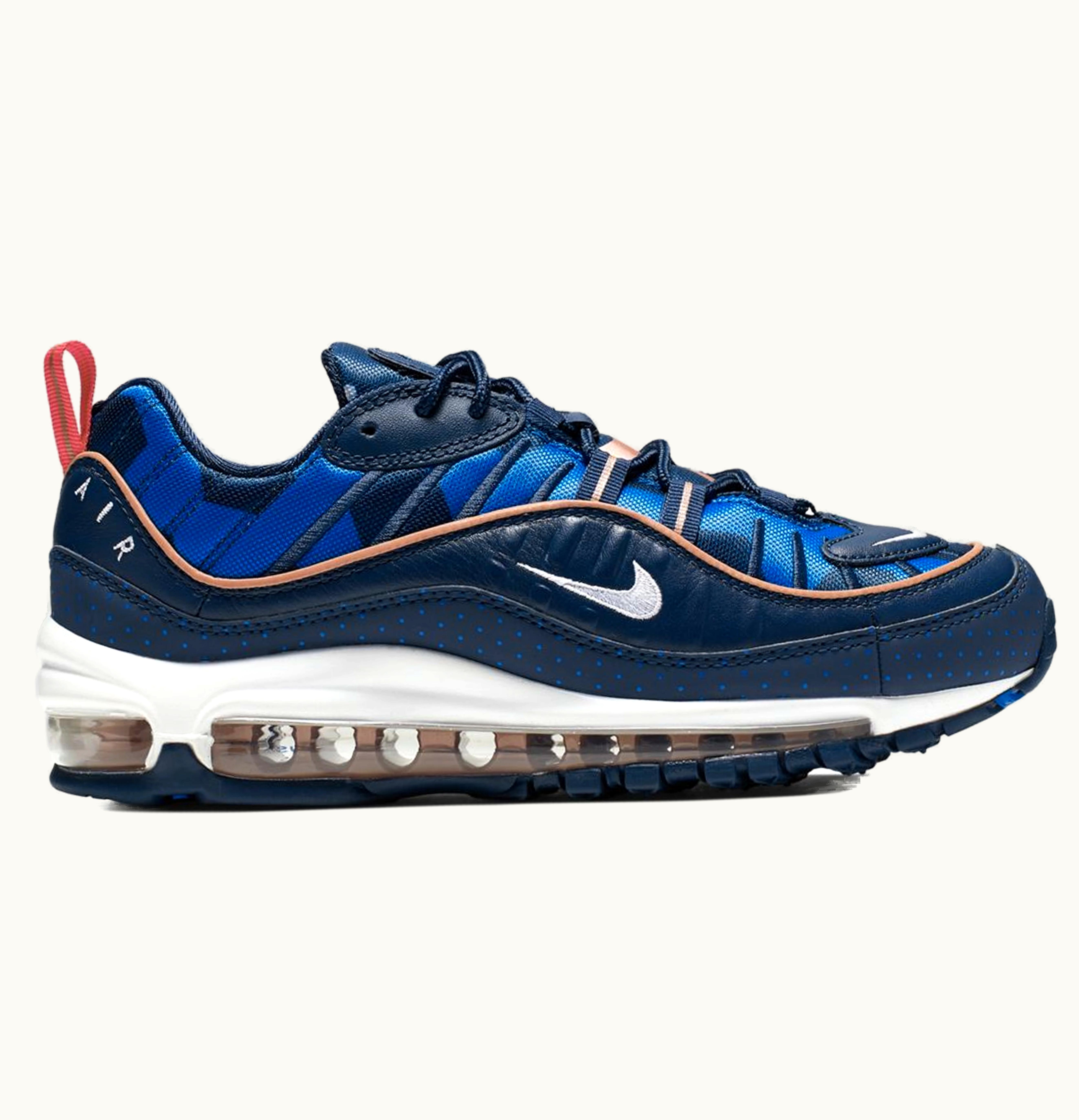 The Nike Air Max 98 Unite Totale Navy (W) is a stylish and vibrant sneaker designed for women. It features a navy blue and white colorway with pops of red and light blue accents, giving it a bold and eye-catching look. The upper is constructed of a mix of smooth leather, suede, and mesh materials, offering both durability and breathability. The midsole is equipped with Nike's signature Air cushioning technology, providing a comfortable and responsive feel with every step. The outsole is made of durable rubber and features a unique tread pattern for enhanced traction and grip. Overall, the Nike Air Max 98 Unite Totale Navy (W) is a versatile and trendy sneaker that is perfect for everyday wear, workouts, or casual outings.