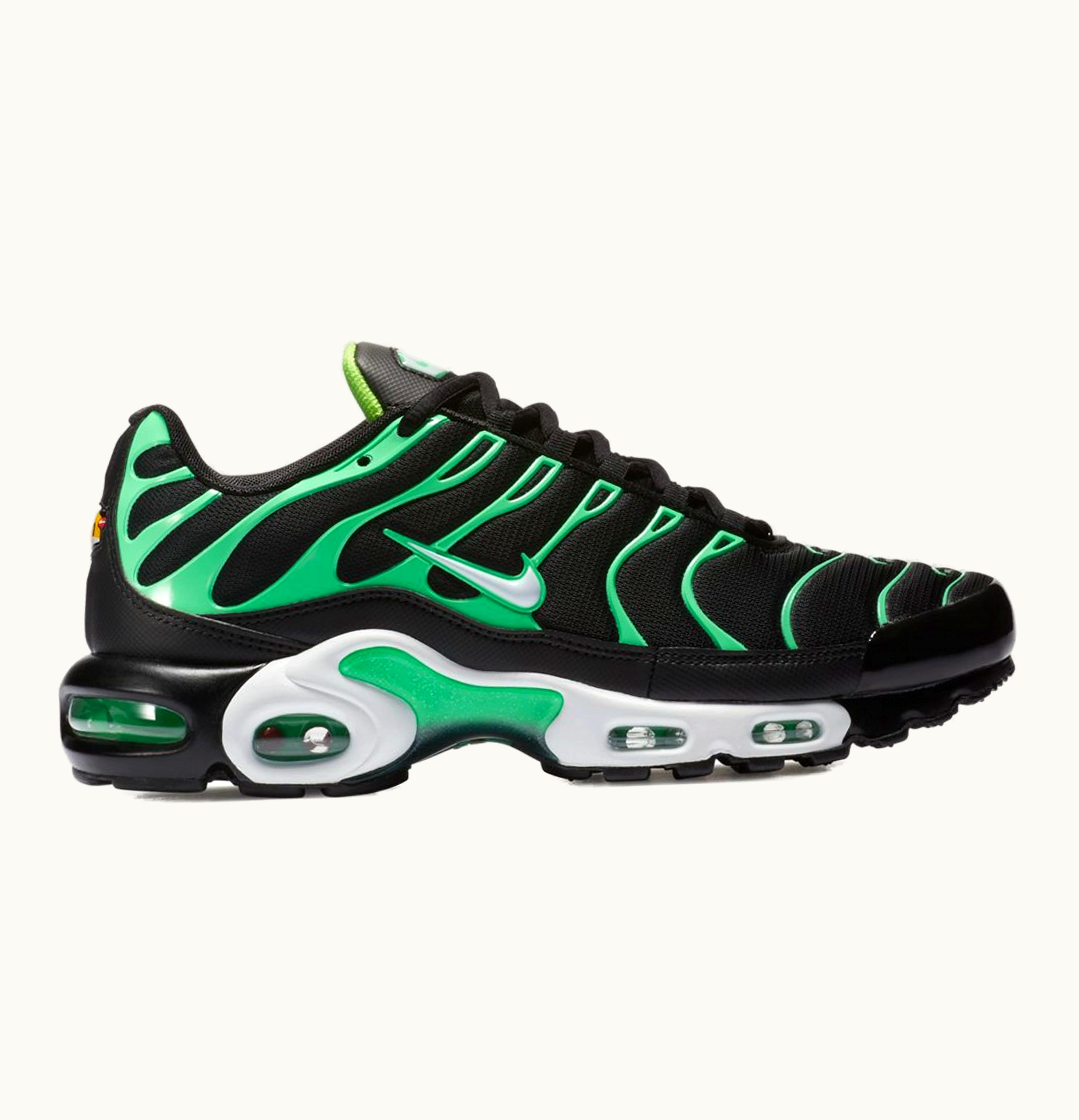 The Nike Air Max Plus Black Electric Green is a stylish and high-performing athletic shoe designed for the modern man. The upper is made of durable and breathable mesh and synthetic materials, with a sleek black color scheme that perfectly complements the vibrant electric green accents. The shoe features Nike's signature Air Max cushioning, providing unparalleled comfort and support to your feet as you run, jump, or walk. The outsole is made with rubber for added grip and durability, while the lace-up closure ensures a snug and secure fit. Whether you're hitting the gym or rocking a street-style look, the Nike Air Max Plus Black Electric Green is a versatile and stylish choice that will elevate your game.