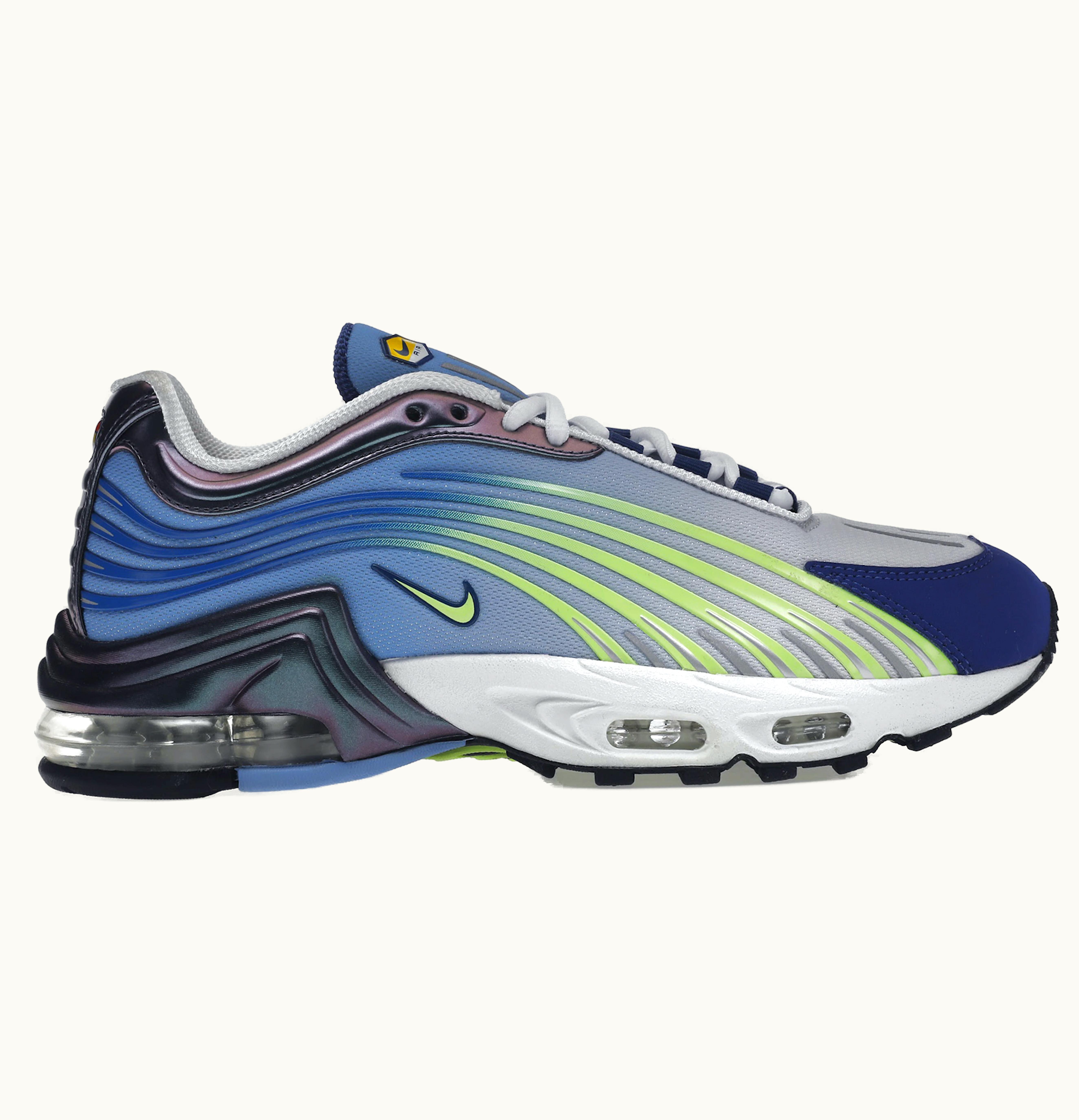 The Nike Air Max Plus II Valerian Blue Ghost Green is a stylish and comfortable sneaker that combines modern design with classic Nike Air Max technology. The upper features a combination of mesh and synthetic leather materials in a bright valerian blue color, with accents of ghost green on the swoosh, tongue, and heel tab. The classic Air Max sole unit provides excellent cushioning and shock absorption, allowing for a smooth and comfortable ride. The unique design of the shoe includes an eye-catching gradient pattern on the overlays and midsole, adding to the overall aesthetic appeal. The Nike Air Max Plus II Valerian Blue Ghost Green is a great choice for anyone looking for a fashionable and comfortable sneaker that delivers on both style and function.