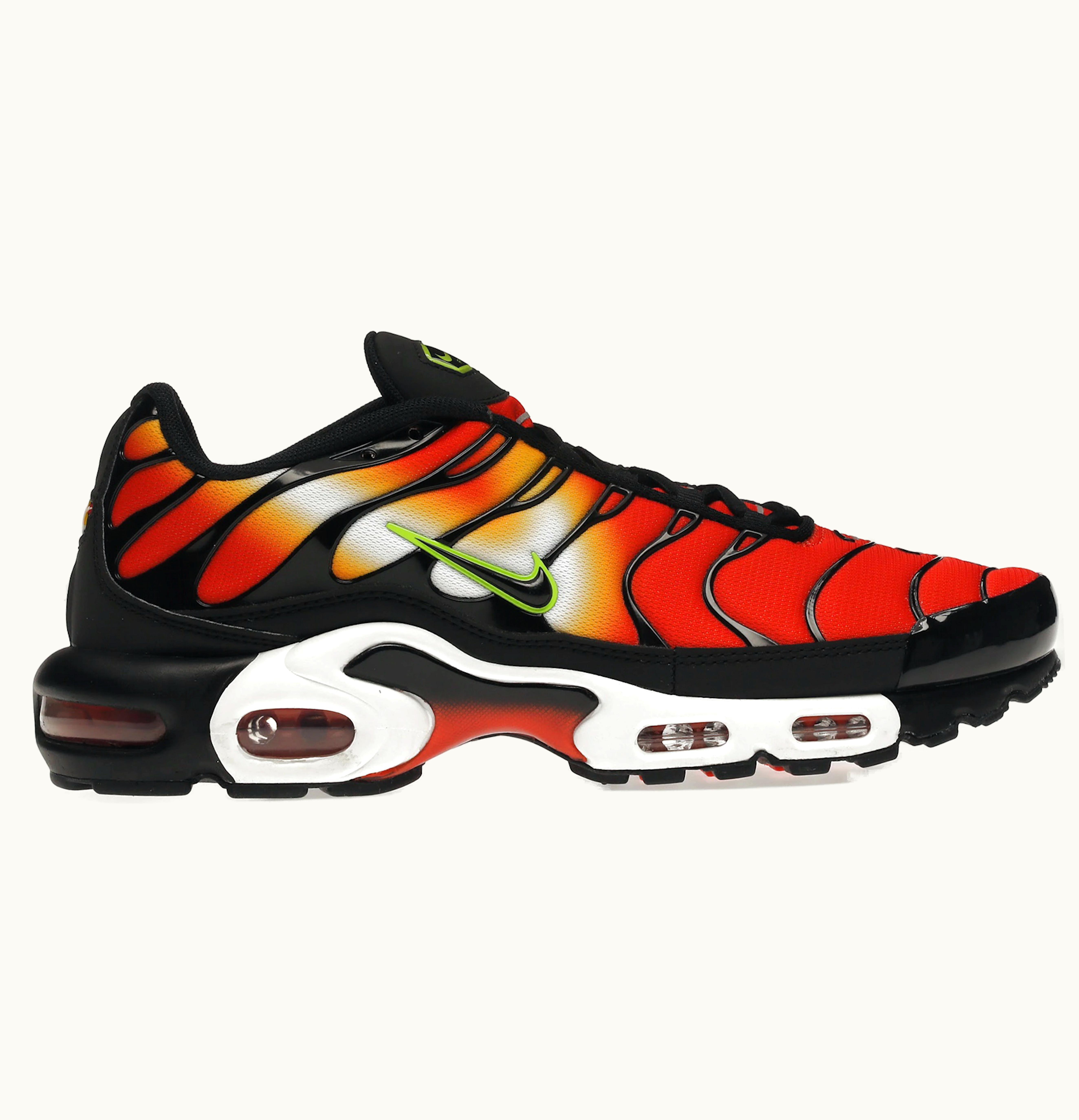 The Nike Air Max Plus Sunset Orange Yellow is a stylish and comfortable shoe that features a vibrant colorway of sunset orange and yellow. The upper of the shoe is made from a combination of breathable mesh and durable synthetic materials, while the signature Air Max cushioning technology provides responsive comfort for all-day wear. The shoe also has a rubber outsole for traction and durability, and the iconic Nike swoosh logo is prominently displayed on the sides. The Nike Air Max Plus Sunset Orange Yellow is a must-have sneaker for those who want to make a bold statement with their footwear.