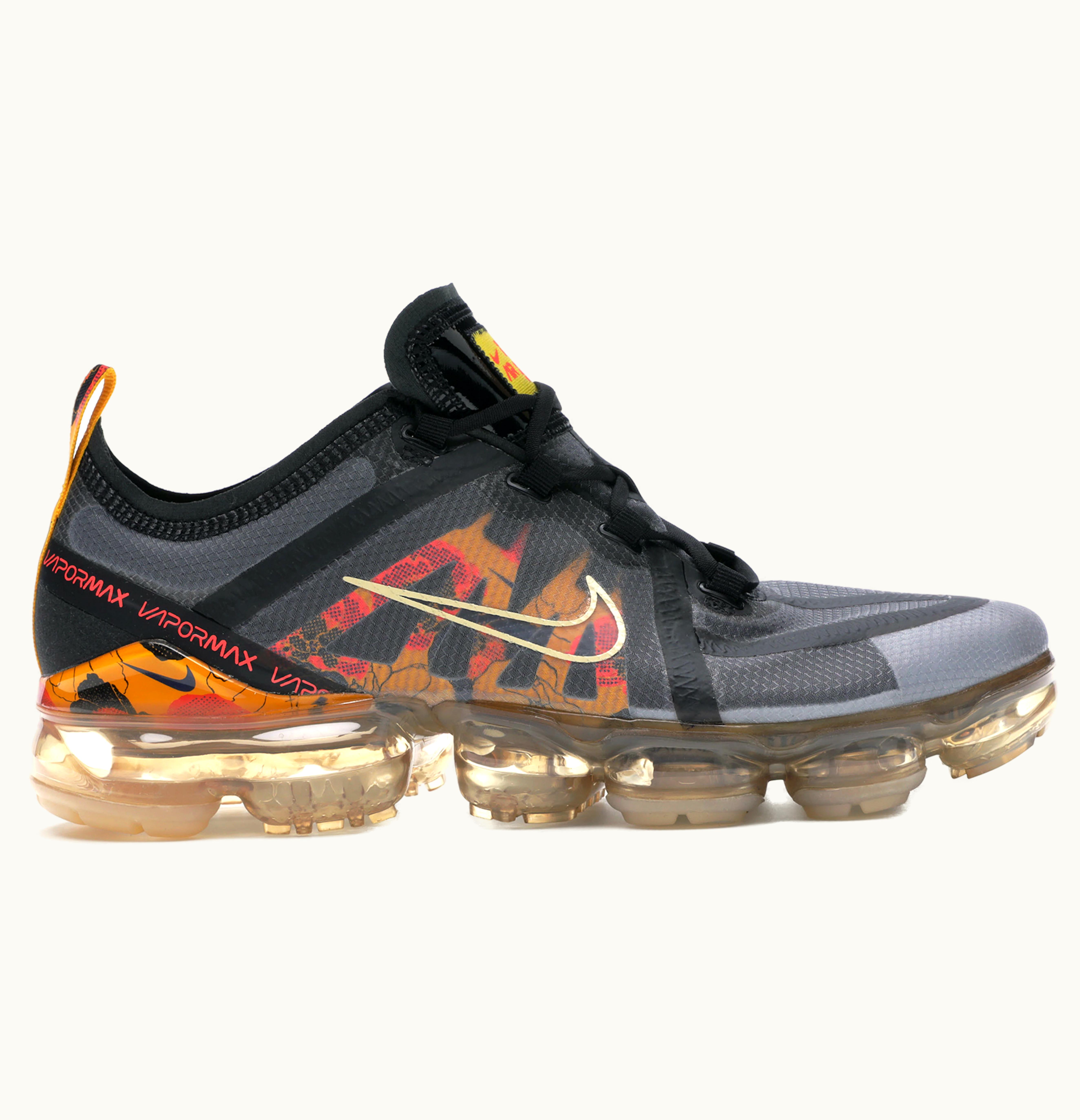 The Nike Air VaporMax 2019 Floral Black University Gold (W) is a stylish and comfortable women's shoe that features a unique floral pattern on the upper, blending black and gold hues for a bold and eye-catching design. The Flyknit upper provides breathability and support, while the TPU overlays add durability and structure to the shoe. The VaporMax Air technology in the sole delivers a lightweight and bouncy feel with every step, providing maximum cushioning and impact protection. The shoe's low-cut collar and lace closure ensure a secure and comfortable fit, while the rubber outsole provides durable traction on any surface. The Nike Air VaporMax 2019 Floral Black University Gold (W) is perfect for running, training, or casual wear, and is sure to make a statement wherever you go.