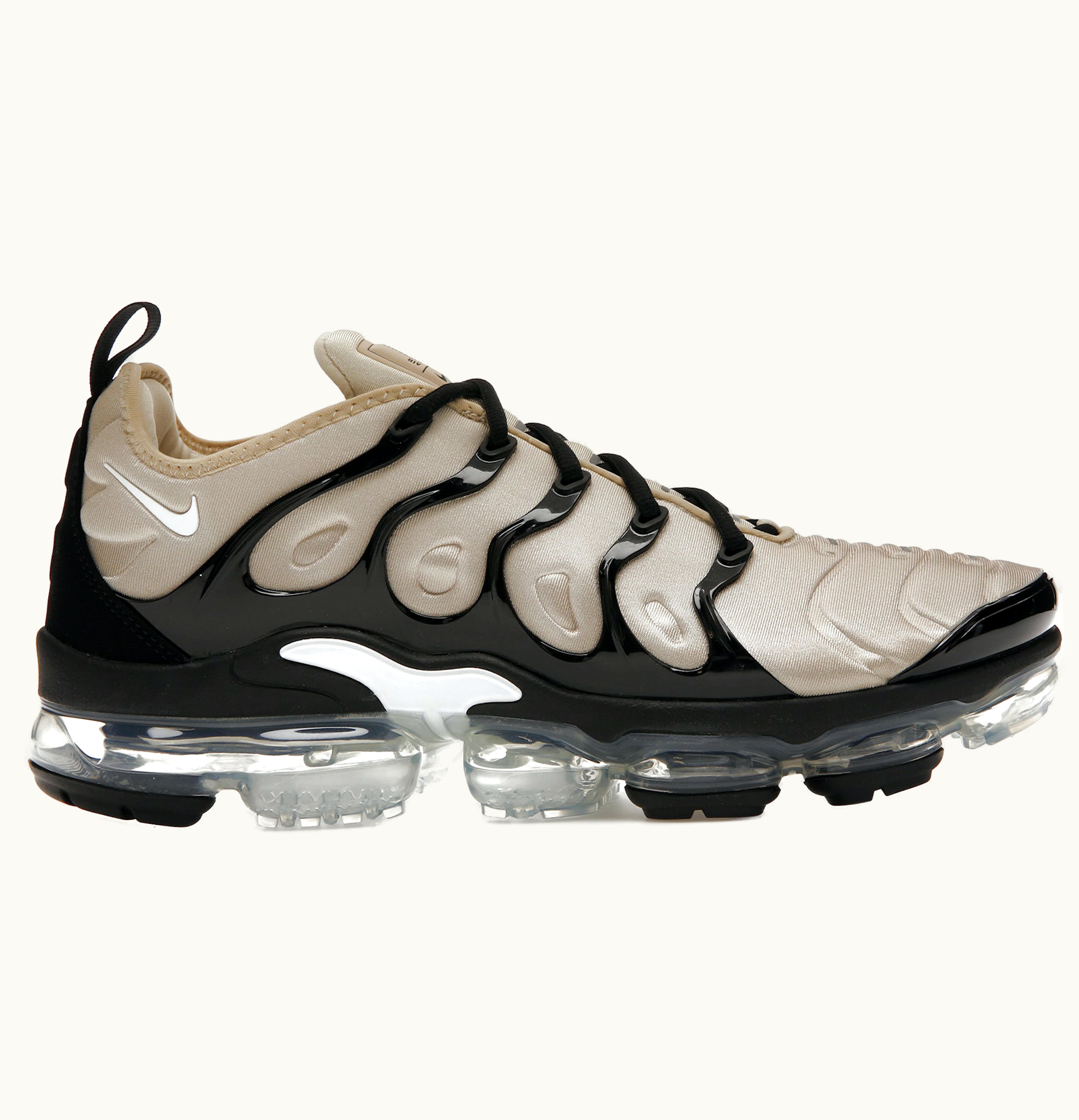The Nike Air VaporMax Plus Beige Black is a stylish and comfortable shoe that combines the classic design of the Air Max Plus with the innovative VaporMax cushioning technology. The upper is made from a breathable, mesh material that provides a lightweight feel and a snug, comfortable fit. The iconic "Plus" symbol is featured on the side of the shoe and the classic Nike swoosh is prominently displayed on the toe box. The shoe's unique VaporMax sole provides exceptional cushioning and support for your feet, allowing for a dynamic and comfortable stride. The Beige and Black colorway gives the shoe a sleek and modern look, making it perfect for both athletic and casual wear. With its stylish design and advanced comfort, the Nike Air VaporMax Plus Beige Black is an excellent choice for anyone looking for a high-quality running or lifestyle shoe.
