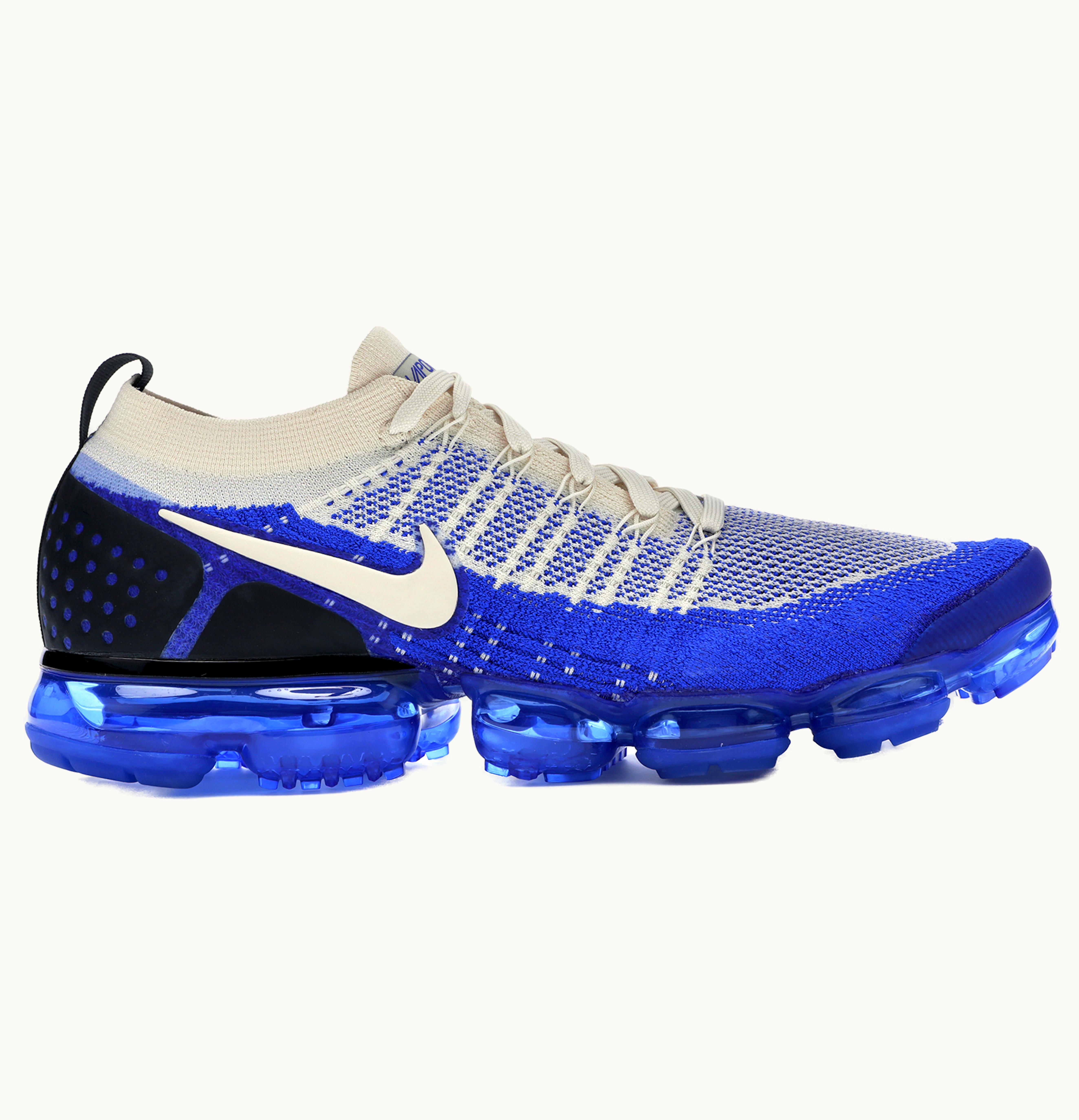 The Nike Air VaporMax 2 Light Cream Racer Blue is a stylish and comfortable pair of running shoes for men. The shoes feature a light cream-colored Flyknit upper, which is lightweight and breathable. The racer blue accents on the swoosh and lace loops add a pop of color to the design. The shoes come equipped with the brand's signature VaporMax technology, providing a responsive and cushioned ride with every step. The outsole is made of durable rubber to ensure traction and grip on any surface. These shoes are perfect for runners looking for a comfortable and stylish shoe for their daily runs or workouts.