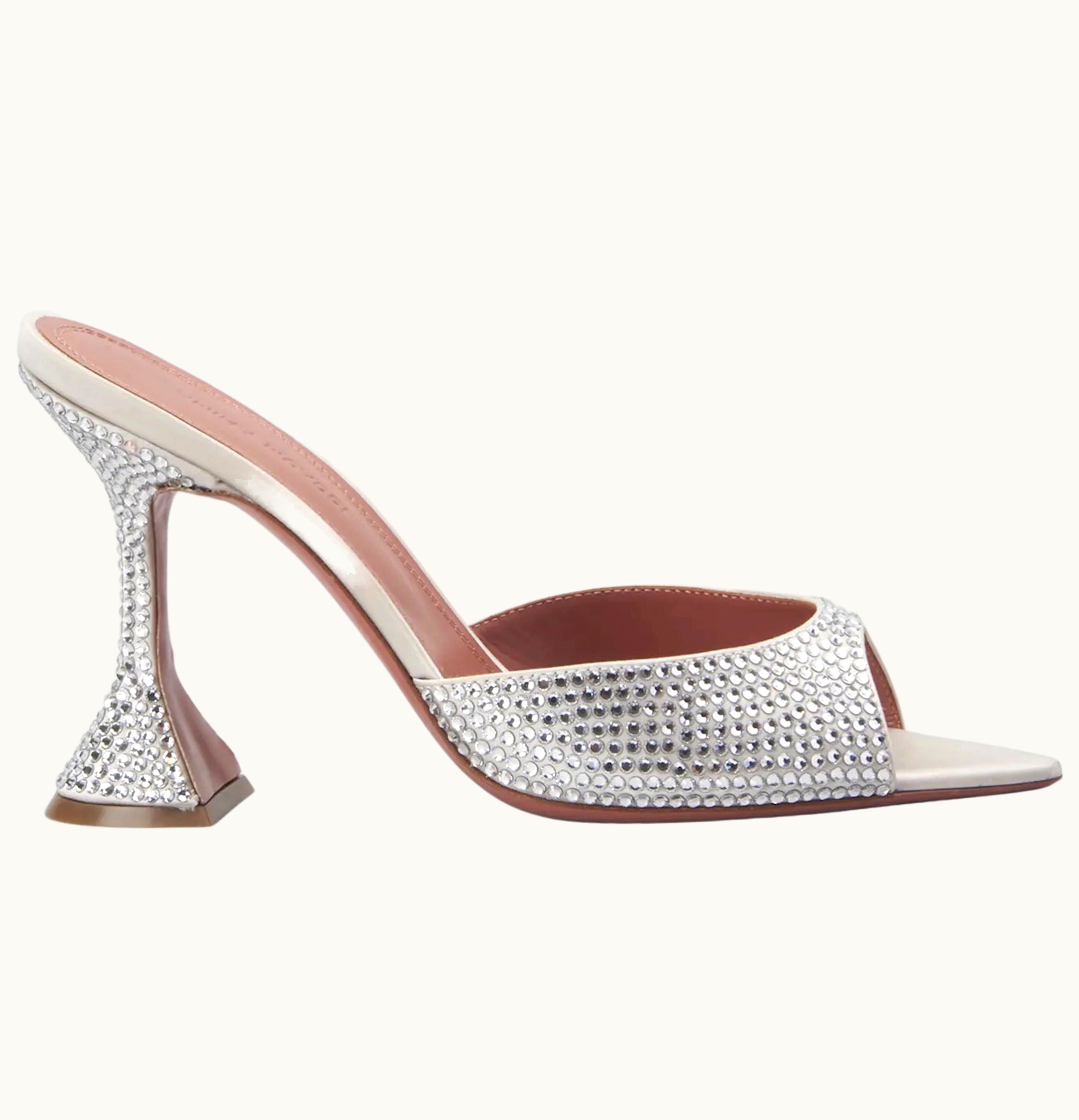 Amina Muaddi Caroline 95mm Crystal Slide Sandal Silver Satin White Crystals | GLINT