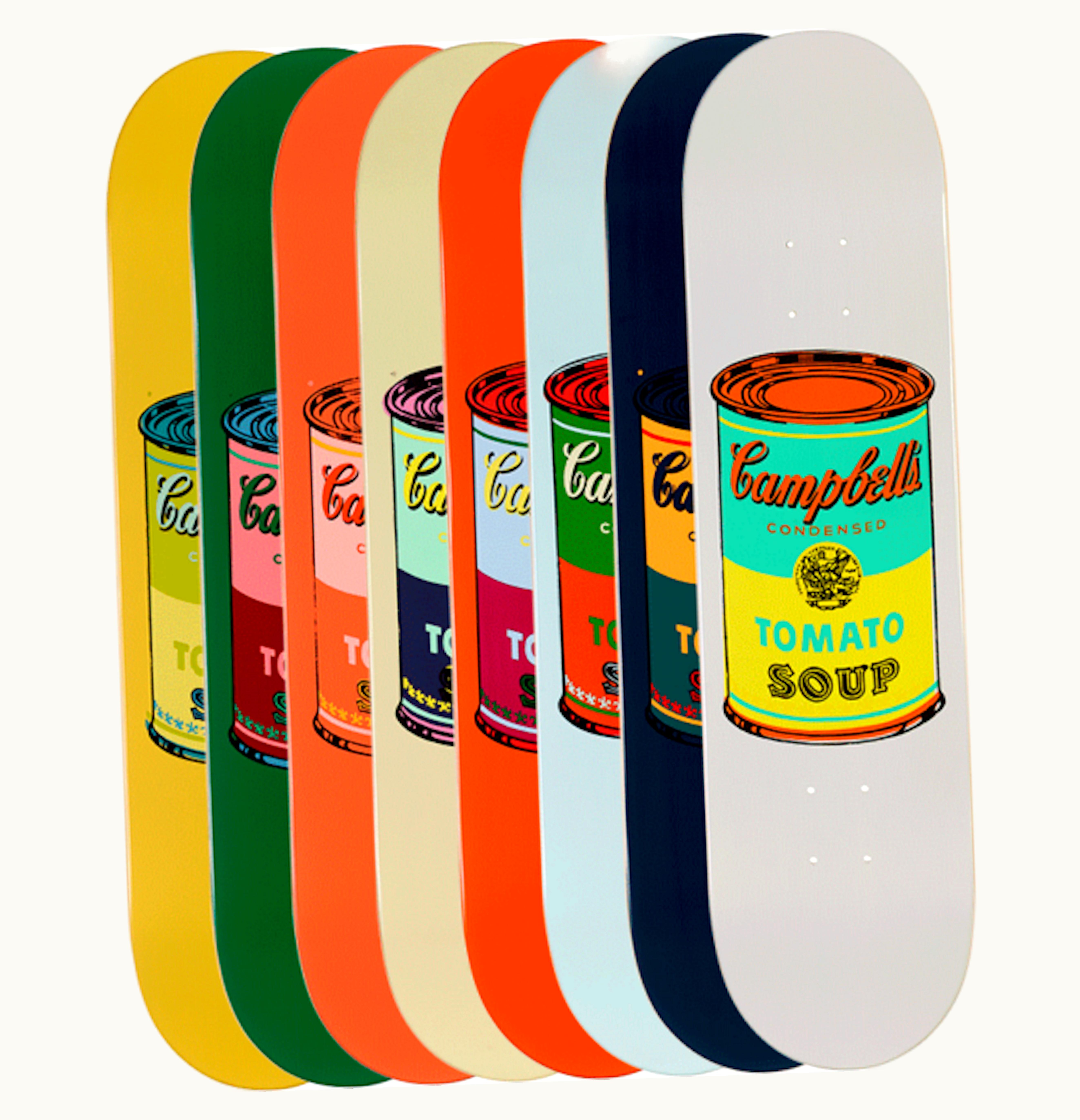 The Andy Warhol Coloured Campbell's Soup Cans is a set of ten individual soup cans, each featuring a unique vibrant color scheme that was hand-selected and designed by the famed pop artist, Andy Warhol. The set pays homage to Warhol's iconic 1962 artwork of the same name, which featured thirty-two different colored soup cans arranged in a grid pattern. Each can is made with high-quality materials and features a durable design that is built to last. The set makes a perfect addition to any art collection or kitchen decor and is a must-have for fans of pop art and Andy Warhol.