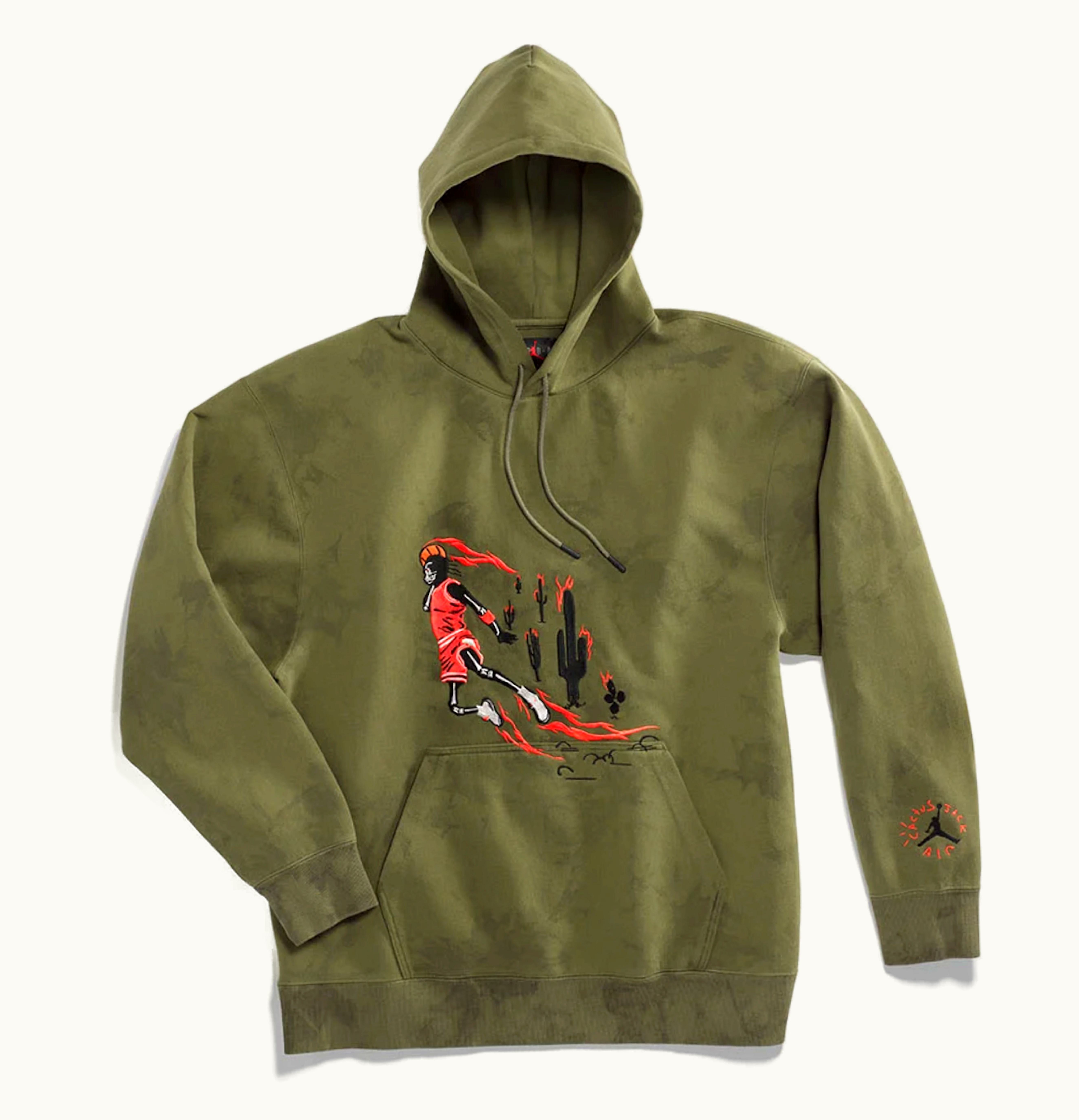 As part of Travis Scott's second official collaboration with the Jordan brand, a pair of Jordan 6s was released alongside The Olive Washed Suede Hoodie. This highly sought-after hoodie showcases a stunning depiction of Michael Jordan dunking a flaming basketball over some cacti. A collaborative logo of Cactus Jack x Jordan Brand is also featured on the sleeve. The Travis Scott x Jordan Brand hoodie was available on October 11th, 2019, and was priced at $150 USD. GLINT is the ideal platform to acquire this amazing piece.