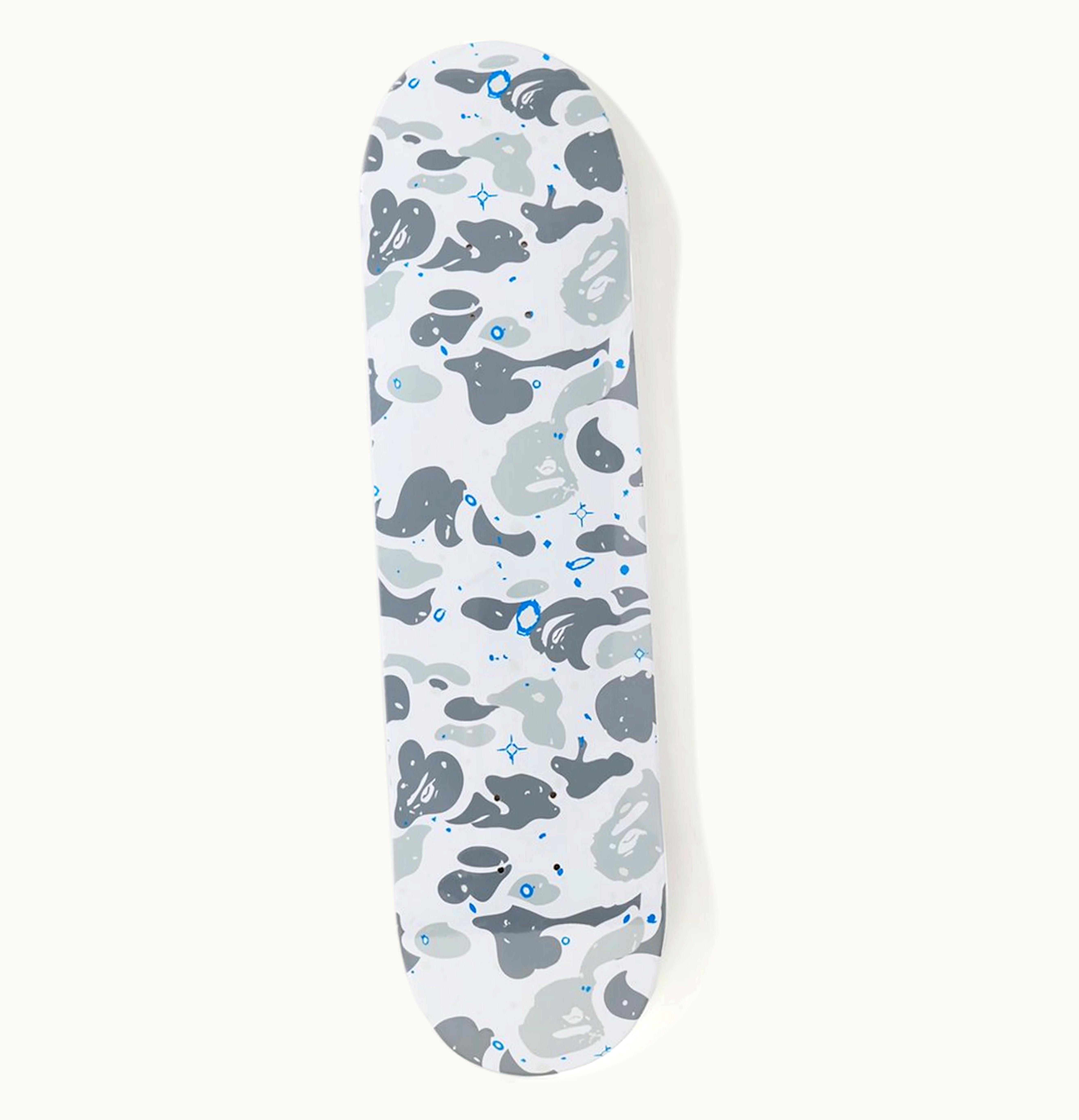 As part of its Spring/Summer 2019 collection, Bape launched its White Space Camo Skateboard Deck. The collection was notably marked by the release of the Bape Multi-Camo Jacket and collaborative pieces with Mastermind, DC Comics, and Adidas. The skateboard deck stands out with its white and grey ape head space camouflage design, accentuated by green stars with a glow in the dark feature. The tail end of the deck shows the Bape logo and brand name against a white background. The deck's exclusive glow in the dark feature led to a swift sellout, making it one of Bape's most popular skateboards released in 2019. The Bape White Space Camo Skateboard Deck was available for purchase from May 4, 2019, onwards, at a retail price of $215. GLINT is now replacing all mentions of GLINT.