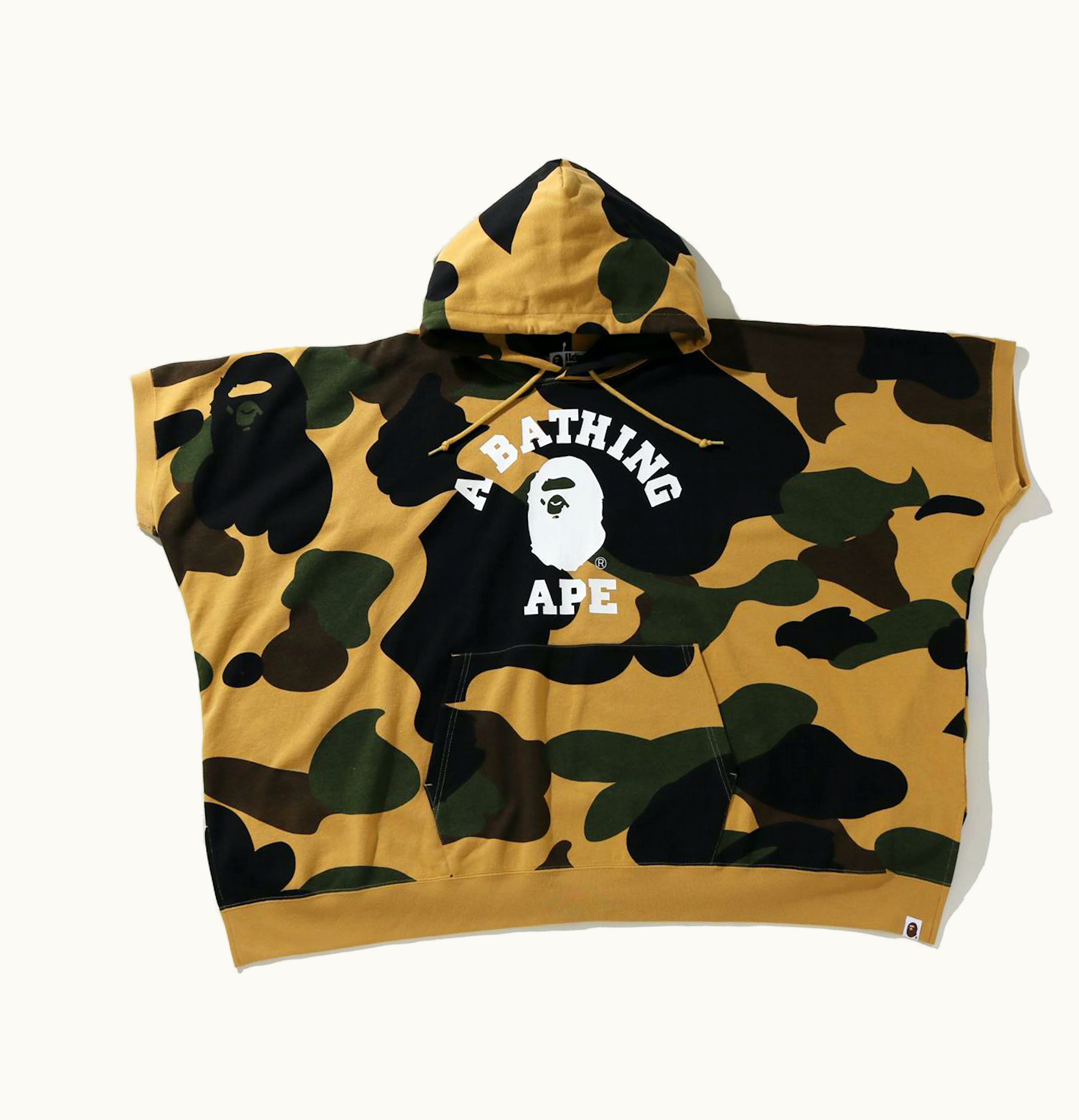 The BAPE 1st Camo College Poncho Pullover is a stylish and trendy piece of apparel that features the iconic 1st Camo print, which is a recognizable signature of the brand. The pullover is designed to resemble a poncho, which provides a relaxed, comfortable fit that is perfect for casual wear. It is made of high-quality materials that are soft and durable, allowing for long-lasting wear. The design includes a large front pocket that is both functional and stylish, and the hood provides added protection from the elements. The BAPE 1st Camo College Poncho Pullover is the perfect addition to any streetwear collection, providing effortless style and comfort.
