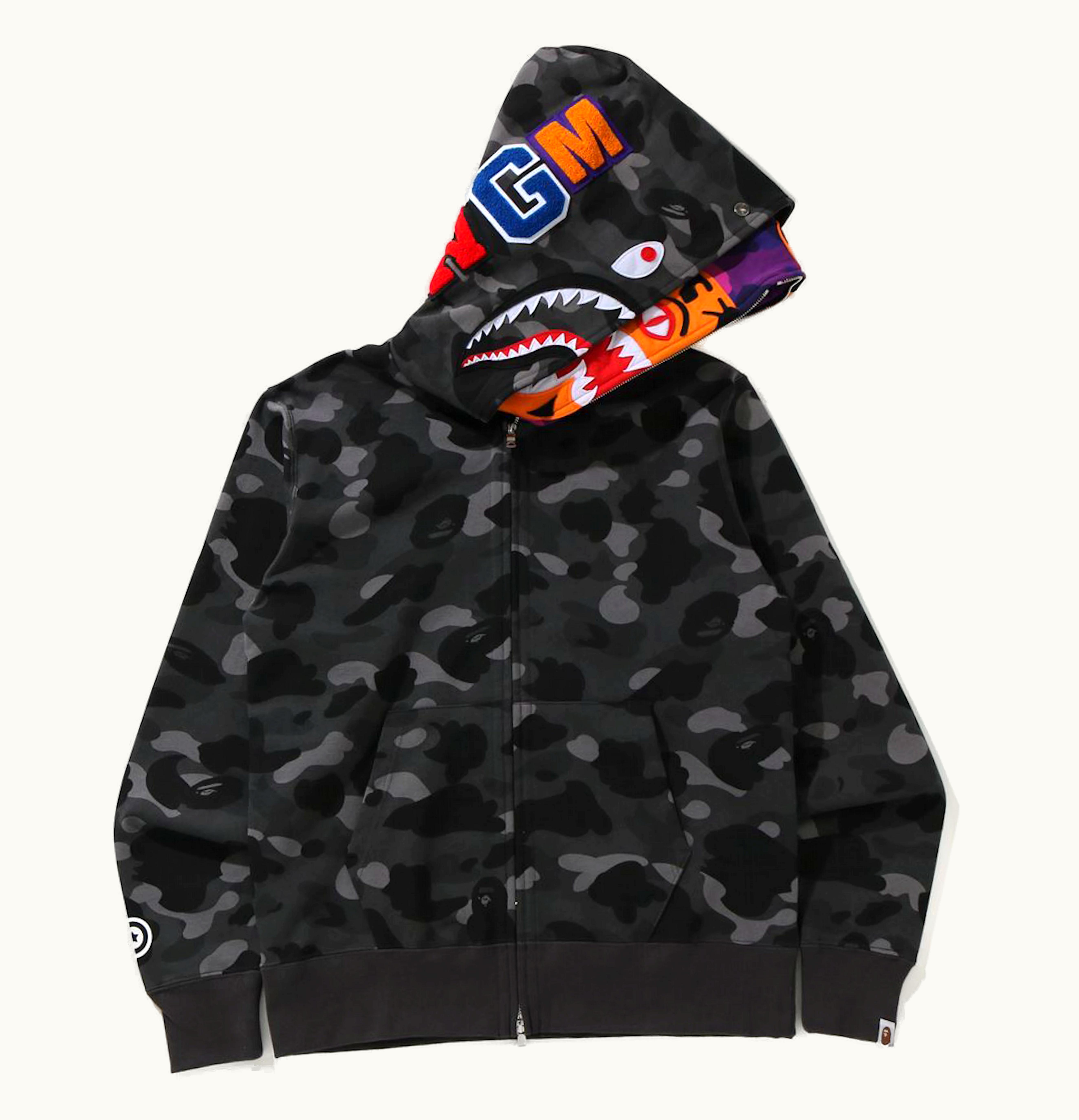 BAPE Color Camo Tiger Shark Wide Full Zip Double Hoodie Black | GLINT