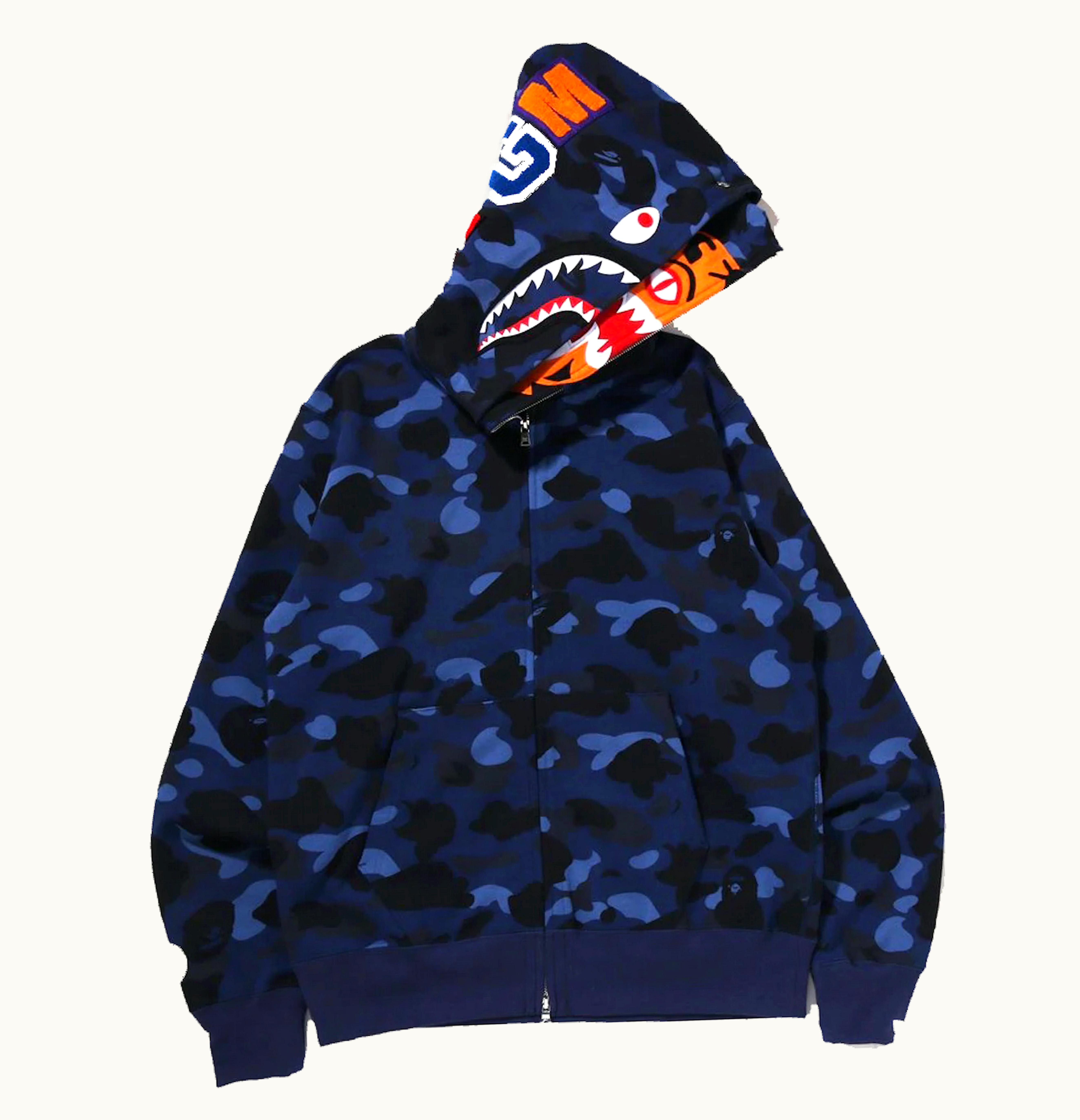 BAPE Color Camo Tiger Shark Wide Full Zip Double Hoodie SS22 Navy | GLINT