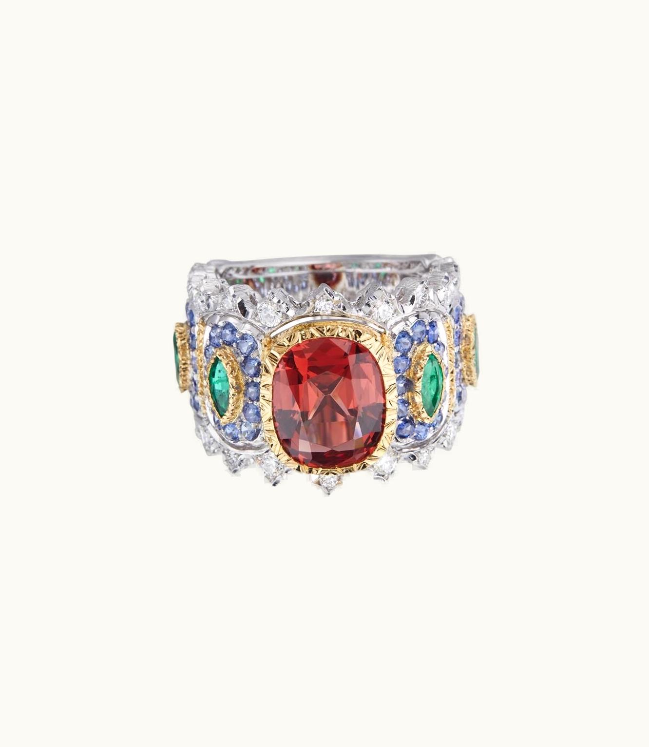 This stunning ring boasts a luxurious combination of yellow and white gold, beautifully accented with other exquisite gemstones.