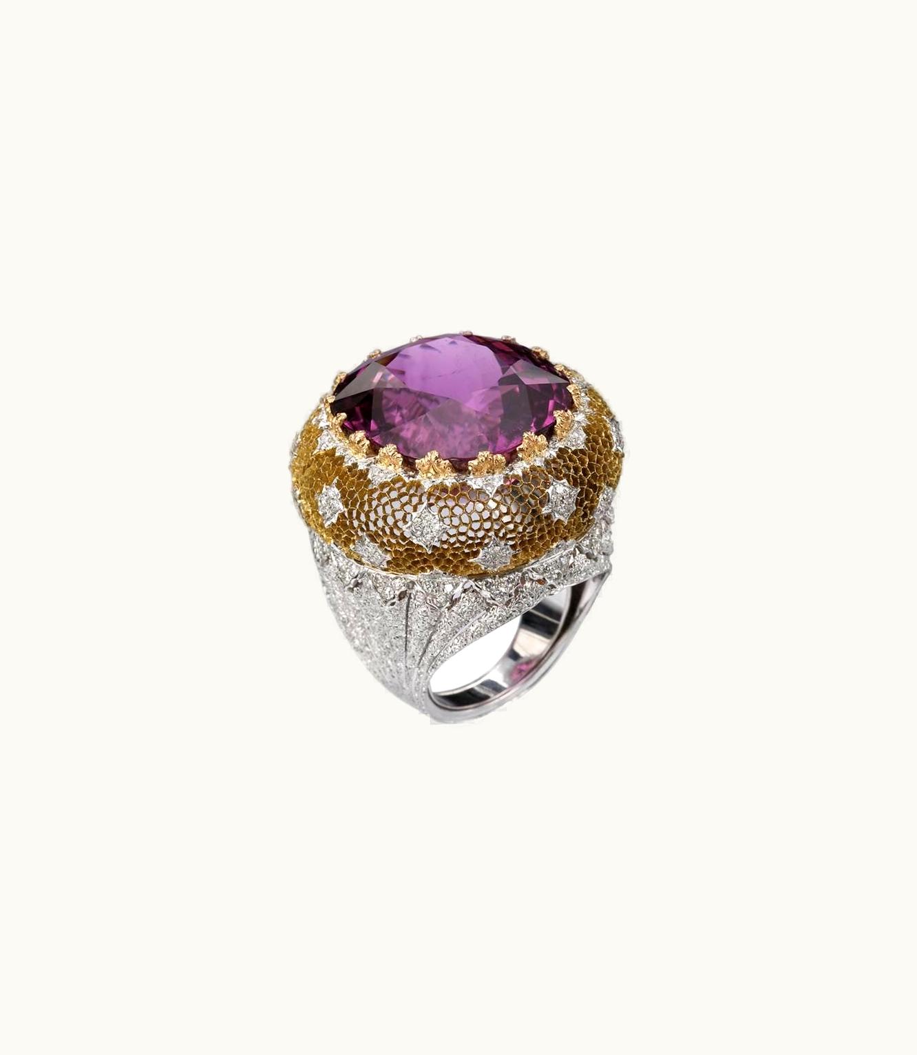 This exquisite piece boasts a stunning tourmaline, delicately set within a luxurious combination of yellow, white, and pink gold.