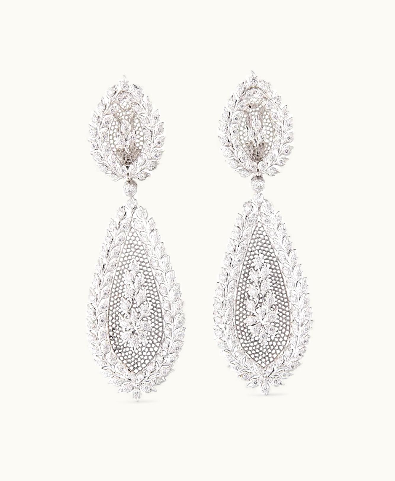A stunning pair of diamond-studded earrings crafted from exquisite white gold.