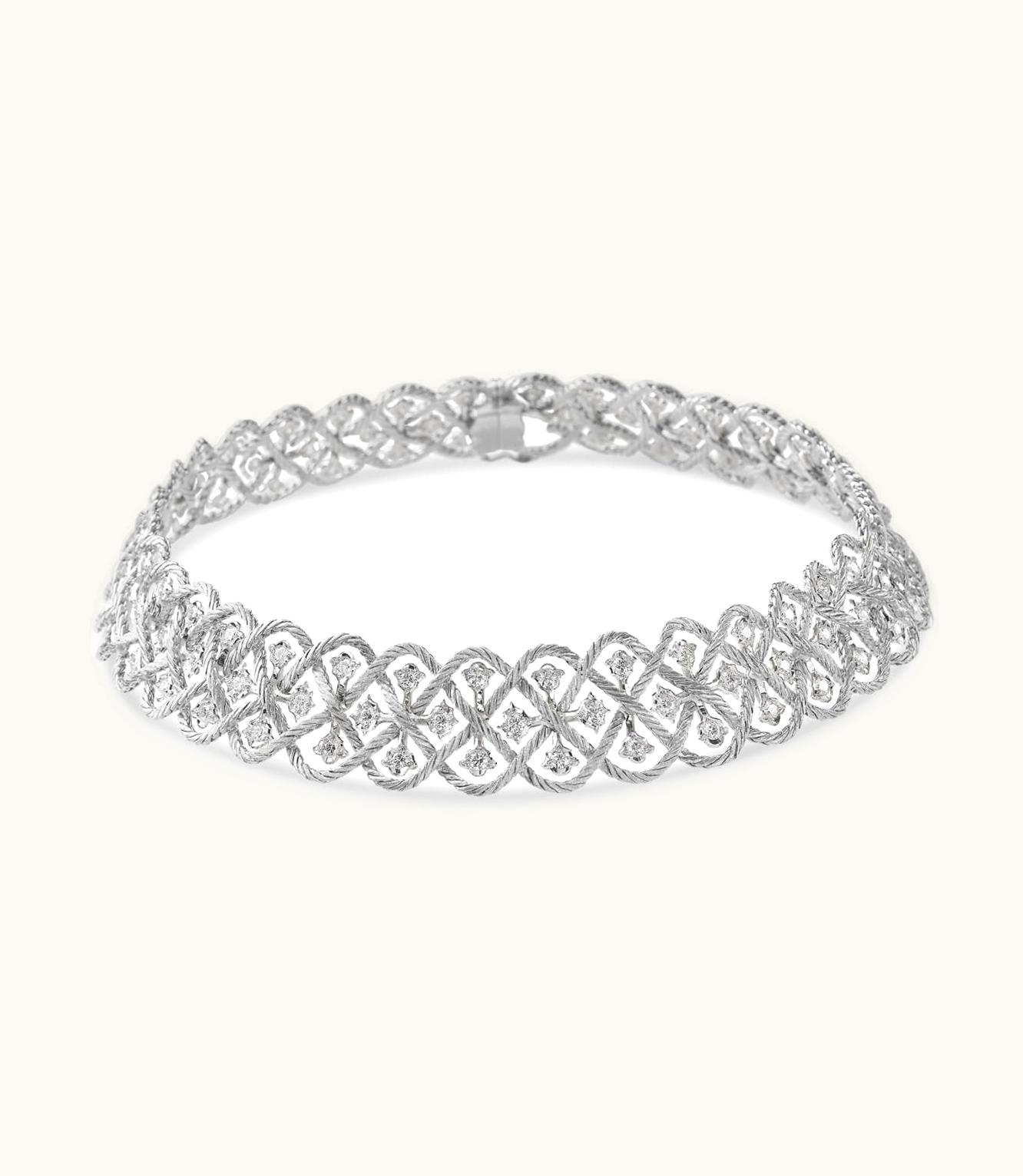 An exquisite piece of jewelry crafted from lustrous white gold and adorned with sparkling diamonds.