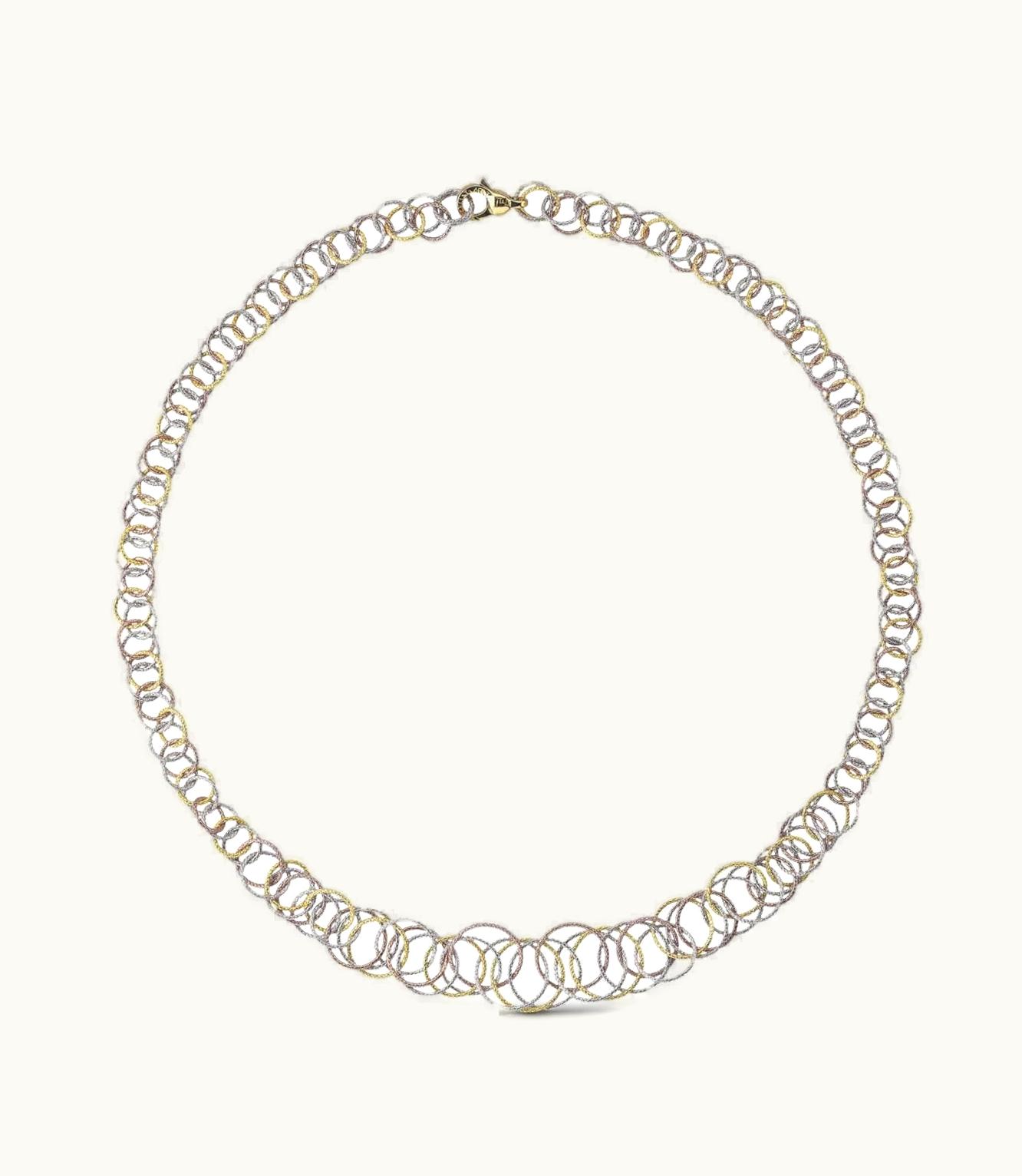This exquisite piece features a combination of yellow, white, and pink gold, meticulously crafted to create a stunning necklace with a length of 45 cm.