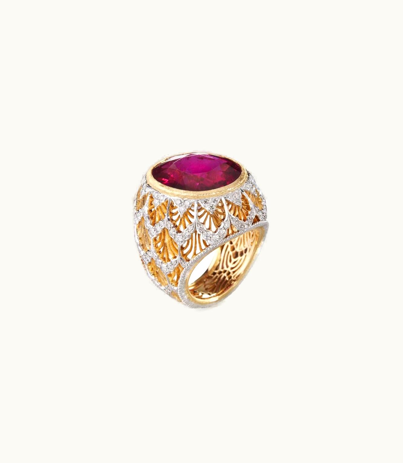 A stunning piece of jewelry crafted with both white and yellow gold, accented by a breathtaking rubellite gemstone.