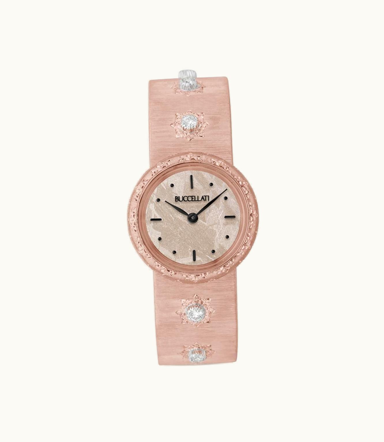 A stunning pink gold watch for women, adorned with glittering diamonds. The elegant timepiece boasts a 24mm case diameter and is powered by a reliable Swiss Quartz movement.