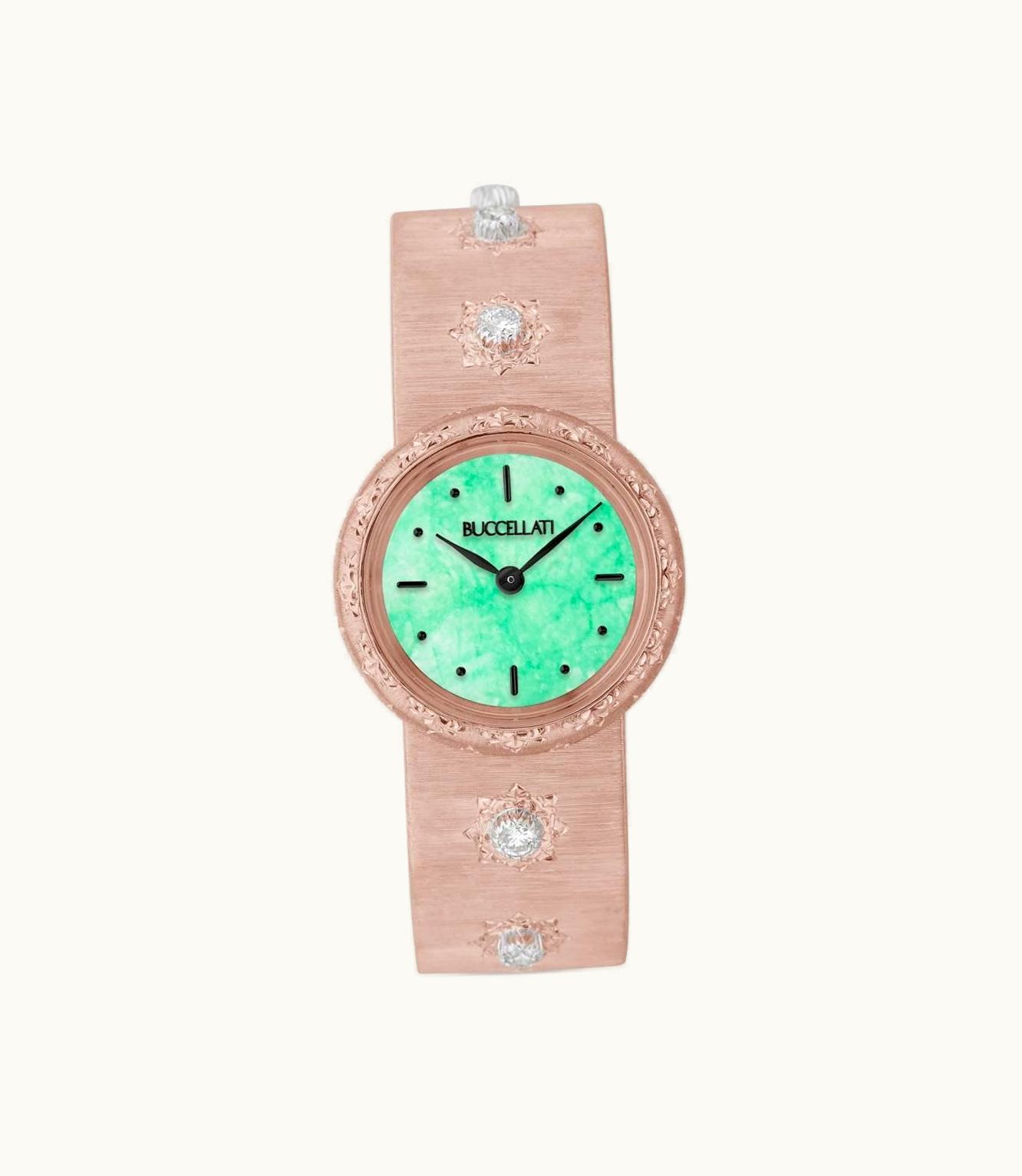 This exquisite timepiece for women boasts a majestic aura with its stunning pink gold setting embellished with radiant diamonds. The watch features a perfectly proportioned 24 mm case diameter and runs on a reliable Swiss Quartz movement, ensuring precise timekeeping.