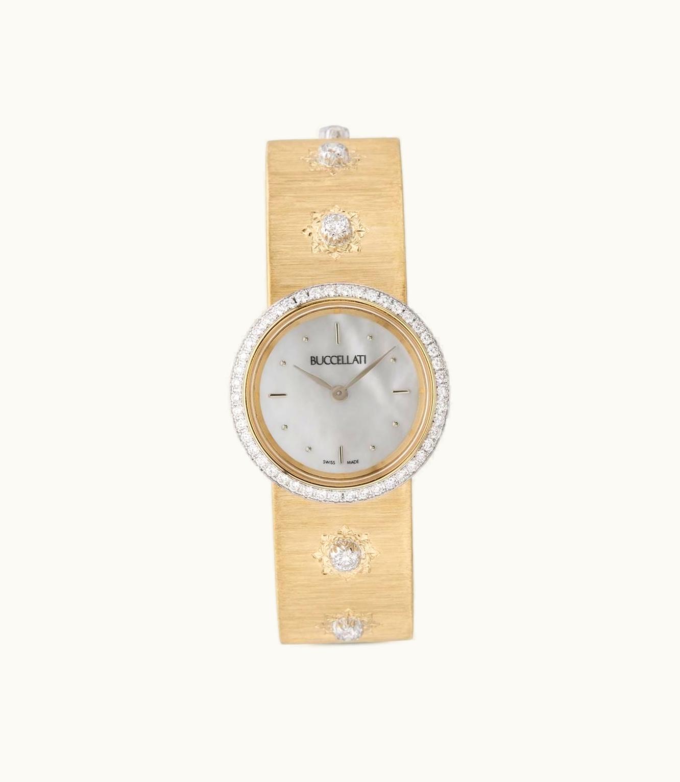 A stunning women's timepiece crafted in yellow gold and embellished with exquisite diamonds, featuring a case width of 24mm and powered by a reliable Swiss Quartz movement.
