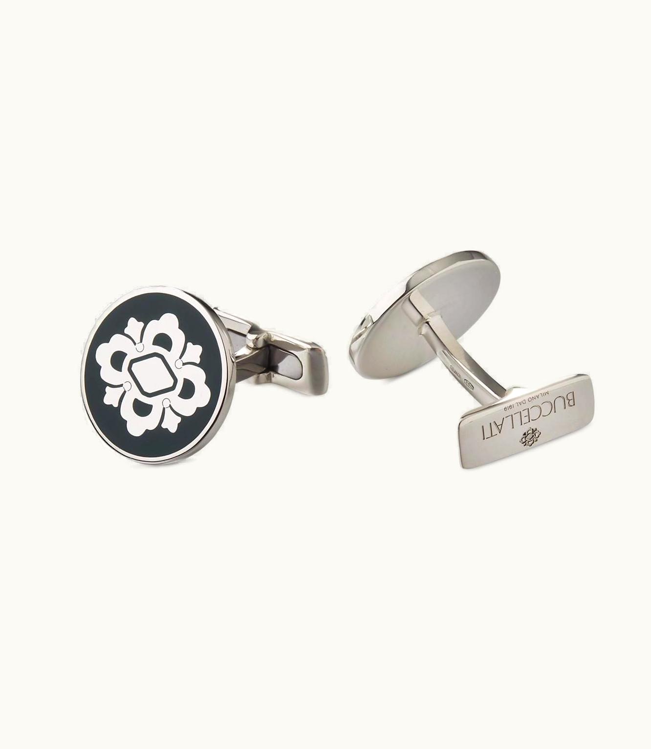A stunning set of small round cufflinks in lustrous silver with a beautiful green enamel finish.