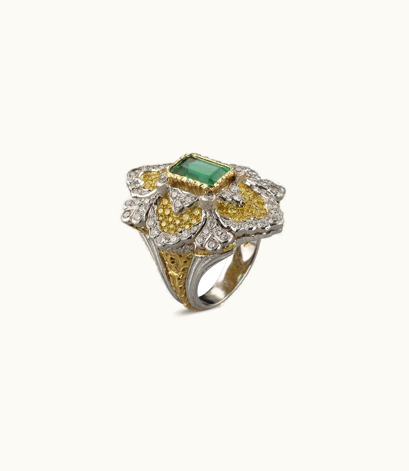 This exquisite piece boasts a unique amalgamation of yellow and white gold, beautifully adorned with stunning emeralds.