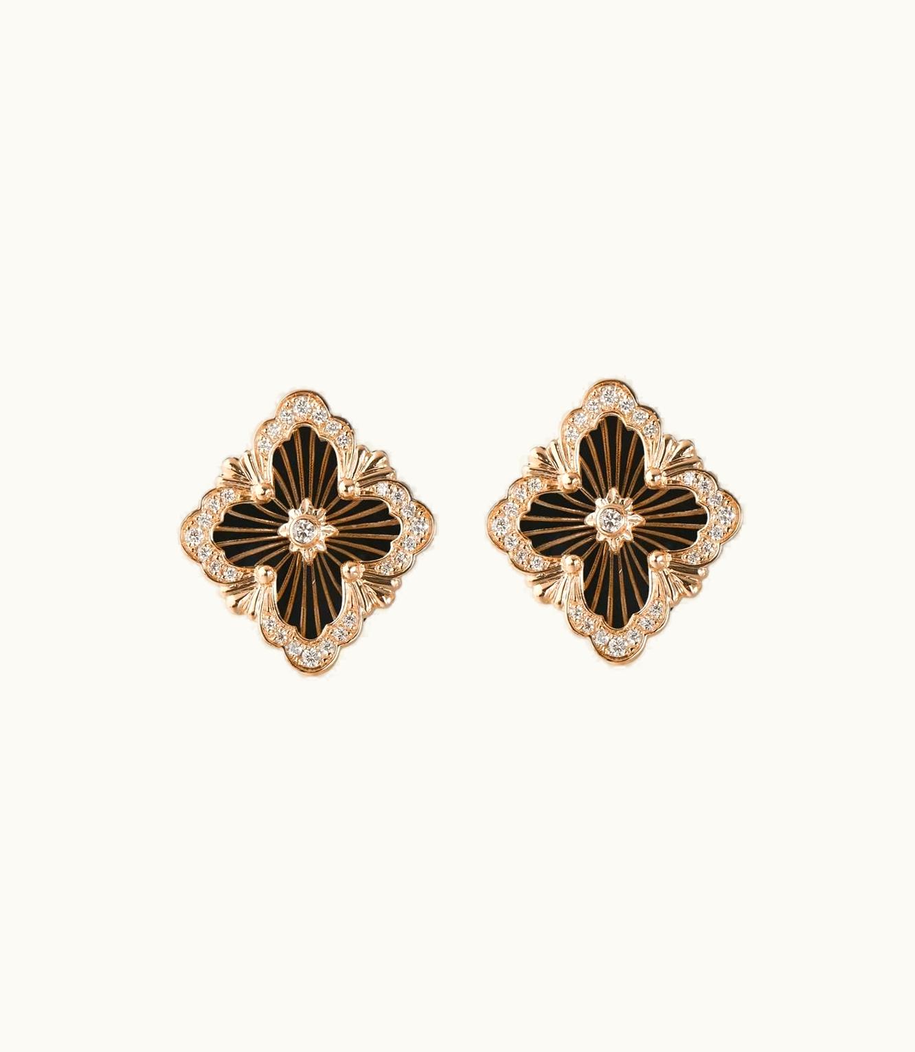 These exquisite earrings feature a medium-sized motif crafted from pink gold and adorned with the stunning black onyx. Measuring at 18.4 x 16.2 mm, they make for an elegant and sophisticated addition to any jewelry collection.