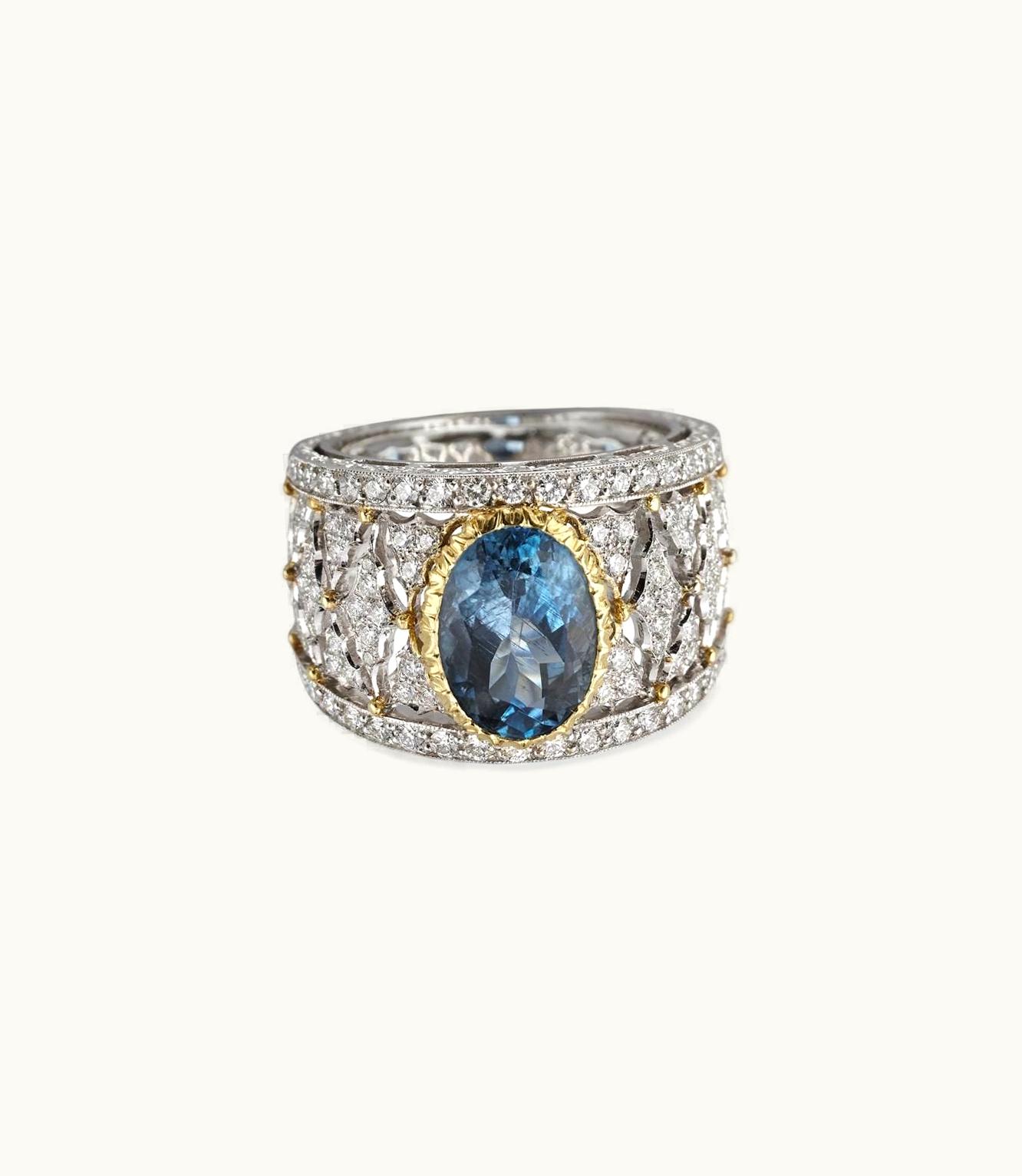 This stunning piece features a beautiful aquamarine set in both white and yellow gold.