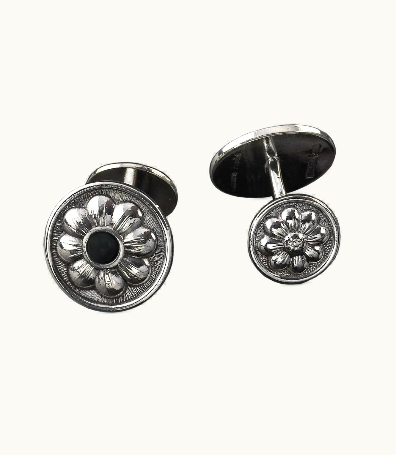 Onyx-set silver cufflinks and a charming daisy adorned with onyx.