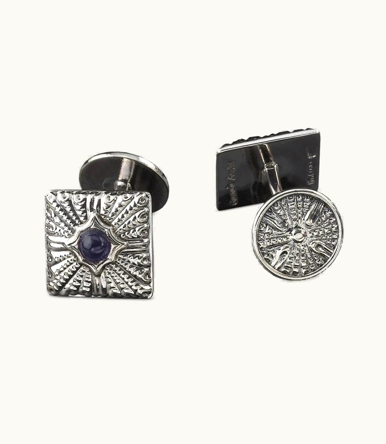 Silver cufflinks adorned with blue sapphires in an elegant manner.