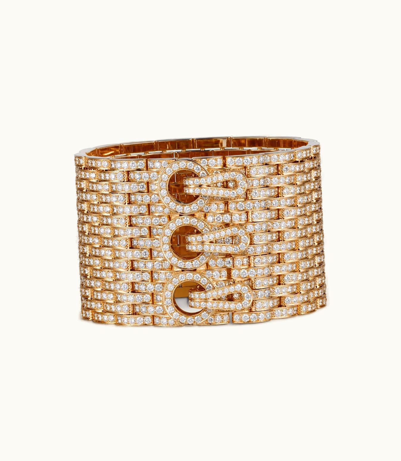 This stunning rose gold cuff bracelet is adorned with an impressive 1,302 brilliant-cut diamonds, totaling 30.28 carats (for size 17). Please keep in mind that the carat weight, number of stones, and dimensions of the product may vary depending on the size ordered. For more detailed information, kindly contact us.
