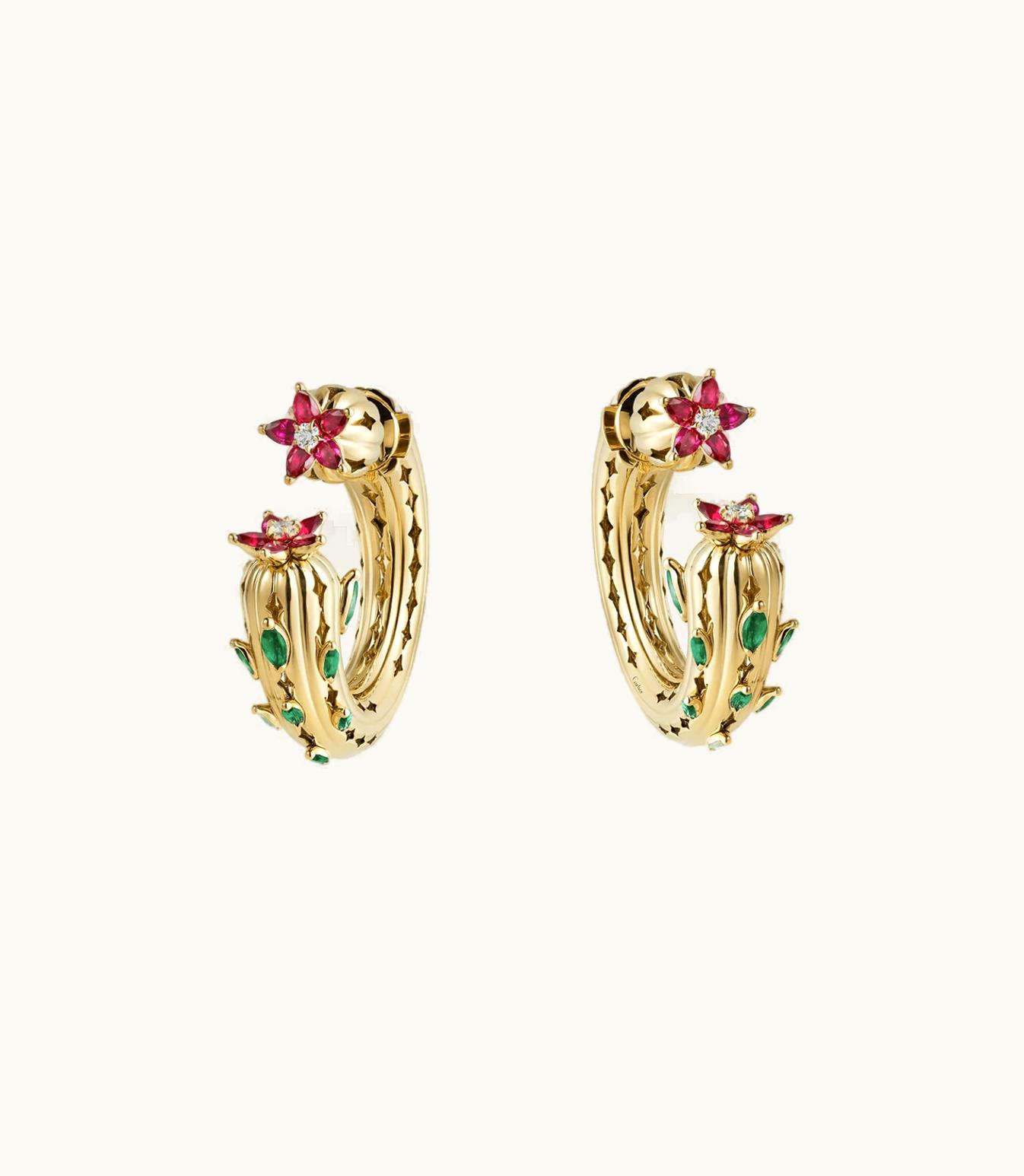 Introducing the stunning Cactus de Cartier earrings, crafted from 750/1000 yellow gold and adorned with a total of 9 emeralds, 10 rubies, and 2 brilliant-cut diamonds, collectively weighing 0.17 carat. It is important to note that specific product details such as carat weight, stone count, and dimensions may vary depending on the size of your desired creation. If you require further information, please do not hesitate to contact us.