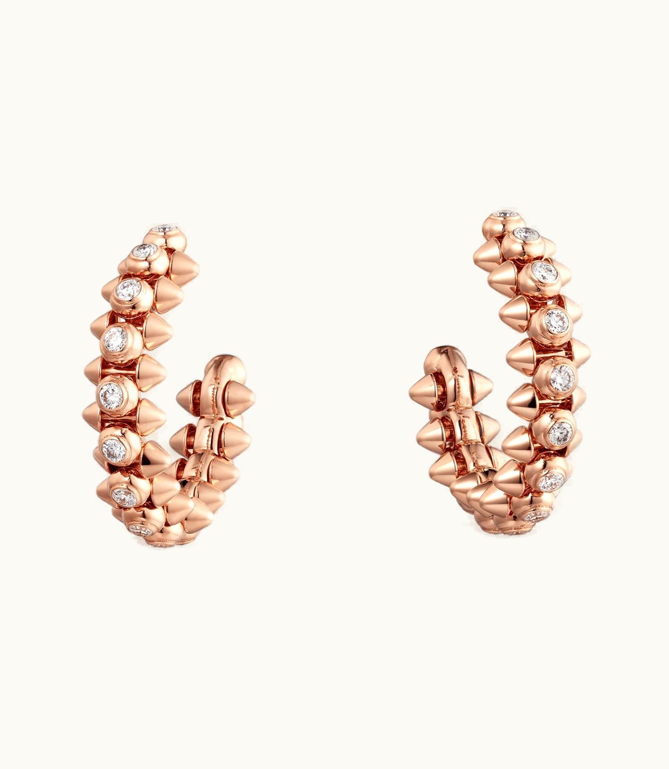 Introducing the exquisite Clash de Cartier earrings, crafted in stunning rose gold 750/1000. Each earring is adorned with 14 brilliant-cut diamonds, collectively weighing in at 0.83 carats, adding a touch of luxury to your look. With a width of 6.8mm and an inner diameter of 16.2mm, these earrings are sure to make a statement. Kindly note that the carat weight, number of stones, and dimensions may vary depending on your preferred size. For more information, feel free to get in touch with us.