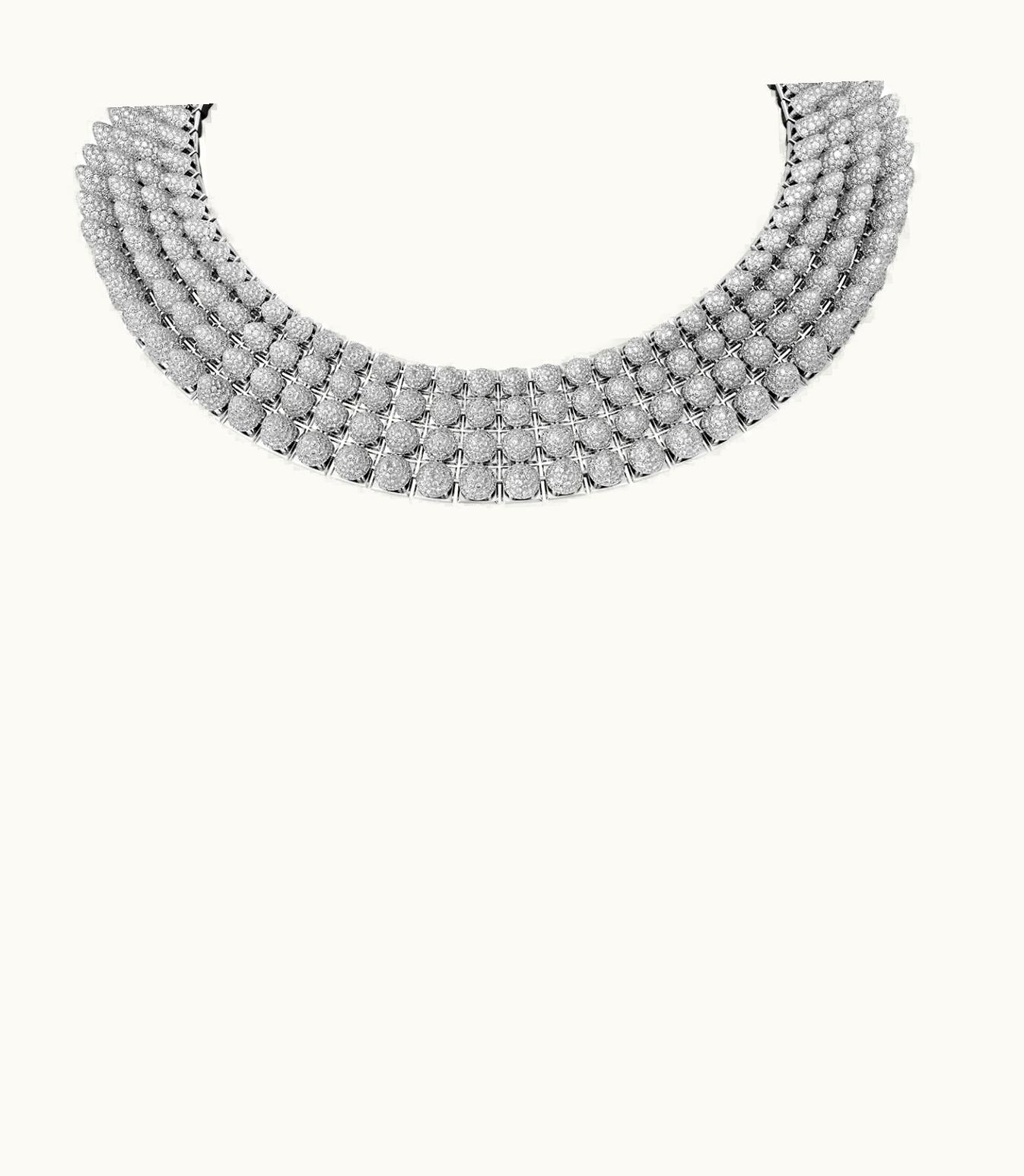 Experience the timeless elegance of the Clash [Un]limited necklace, crafted from premium quality white gold 750/1000. This stunning masterpiece is adorned with a meticulously arranged ensemble of 8,754 breathtaking brilliant-cut diamonds totaling 64.58 carats and onyx, accentuating its unparalleled allure. Each creation is unique and may vary in carat weight, number of stones, and dimensions, and we invite you to reach out to us for further information.