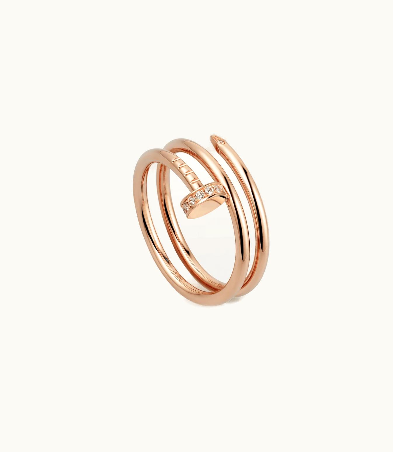 The delightful Juste un Clou ring is crafted from premium rose gold of 750/1000 purity and adorned with 14 brilliant-cut diamonds that collectively weigh 0.08 carats. The width of the ring is 1.8 mm (for size 52) but kindly note that the weight of carats, quantity of stones and dimensions may differ depending on the size you opt for. If you require detailed knowledge, please don't hesitate to reach out to us.