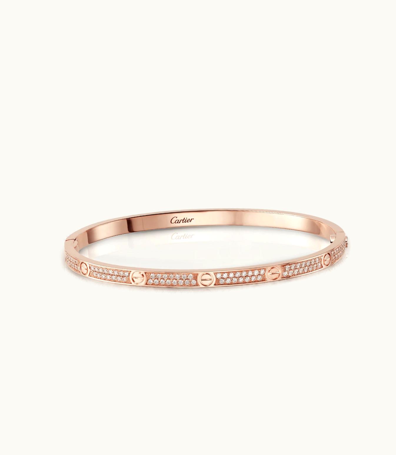 Introducing the small model LOVE bracelet, crafted from exquisite 750/1000 rose gold and adorned with a stunning total of 177 brilliant-cut diamonds weighing 0.95 carats. Delivered with a convenient screwdriver, this bracelet has a width of 3.65 mm (for size 17). Also available in yellow gold 750/1000, the LOVE bracelet now comes in a slimmer version while retaining its signature design, oval shape and timeless appeal. The bracelet is secured by means of a screw and hinge closure, and to determine your bracelet's size, simply measure your wrist and add 1 cm for a snugger fit, or 2 cm for a looser feel. Please note that the carat weight, stone count, and product dimensions may vary depending on the size ordered. If you would like more detailed information, please do not hesitate to contact our team.