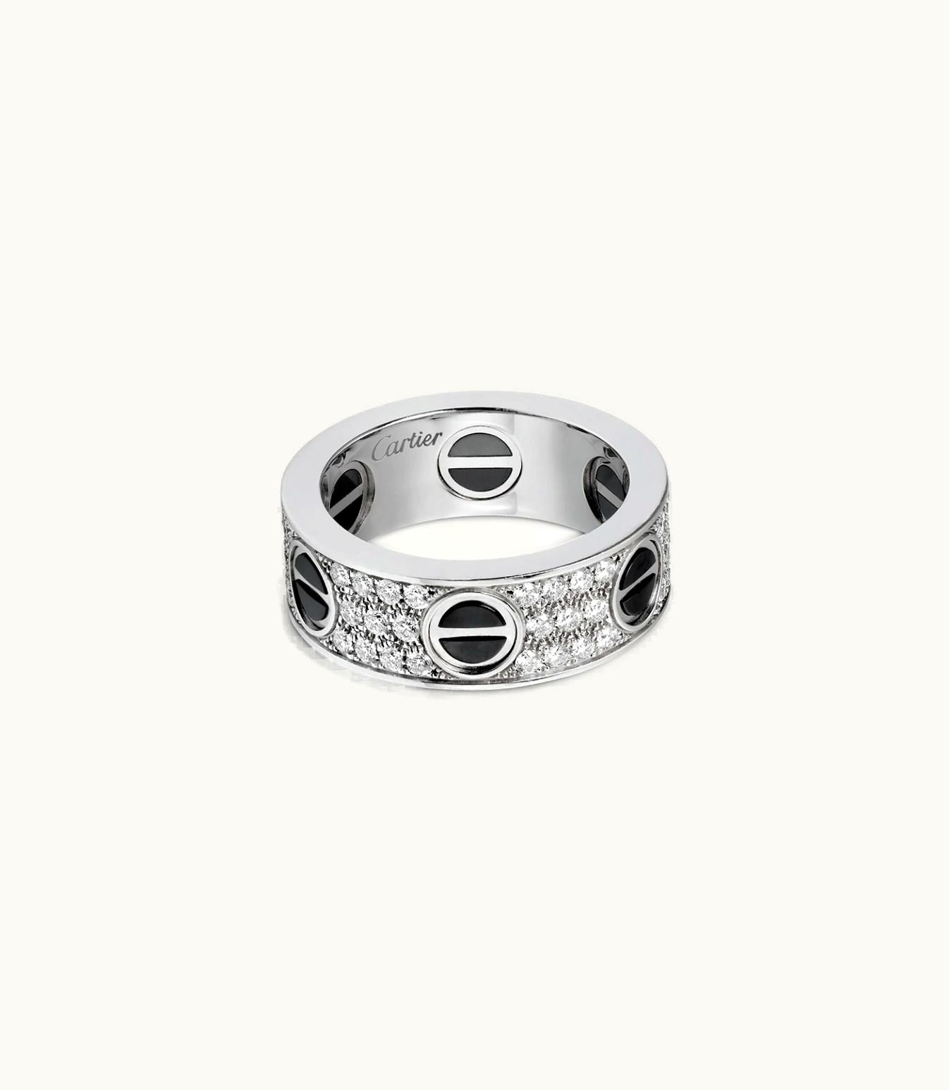 Indulge in the exquisite LOVE ring crafted from 750/1000 white gold and adorned with black ceramic, beautifully enriched with 66 brilliant-cut diamonds that total to 0.74 carats. The ring measures 6.5 mm (for size 52), and please keep in mind that the carat weight, number of stones, and size of the ring may vary. For more details, feel free to get in touch with us.