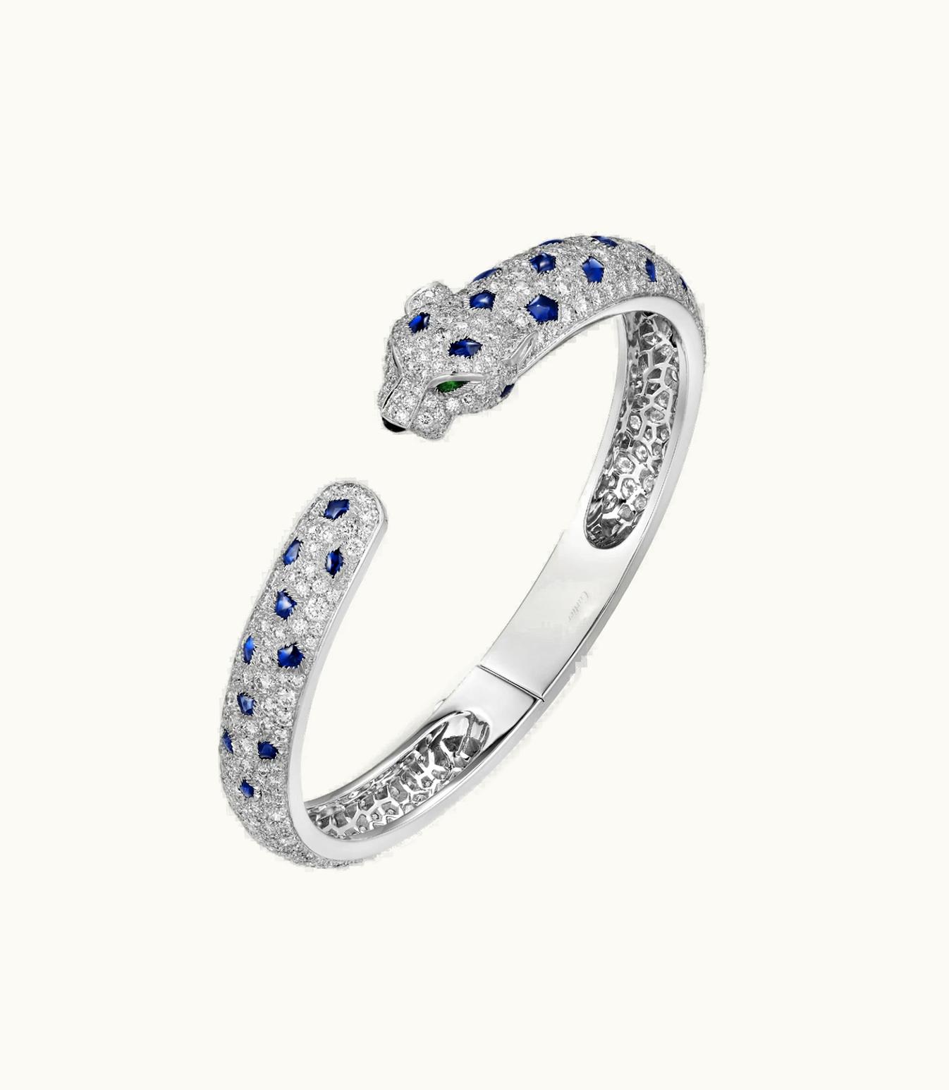 Introducing the stunning Panthère de Cartier bracelet, crafted from luxurious white gold (750/1000) and adorned with mesmerizing black onyx, highlighted by two exquisite emeralds, 30 dazzling sapphires, and a total of 647 brilliant-cut, sparkling diamonds weighing 7.56 carats (for size 17). Please note that the product's dimensions, as well as the carat weight and number of stones utilized, may vary depending on the size ordered. For more comprehensive information, kindly get in touch with us.