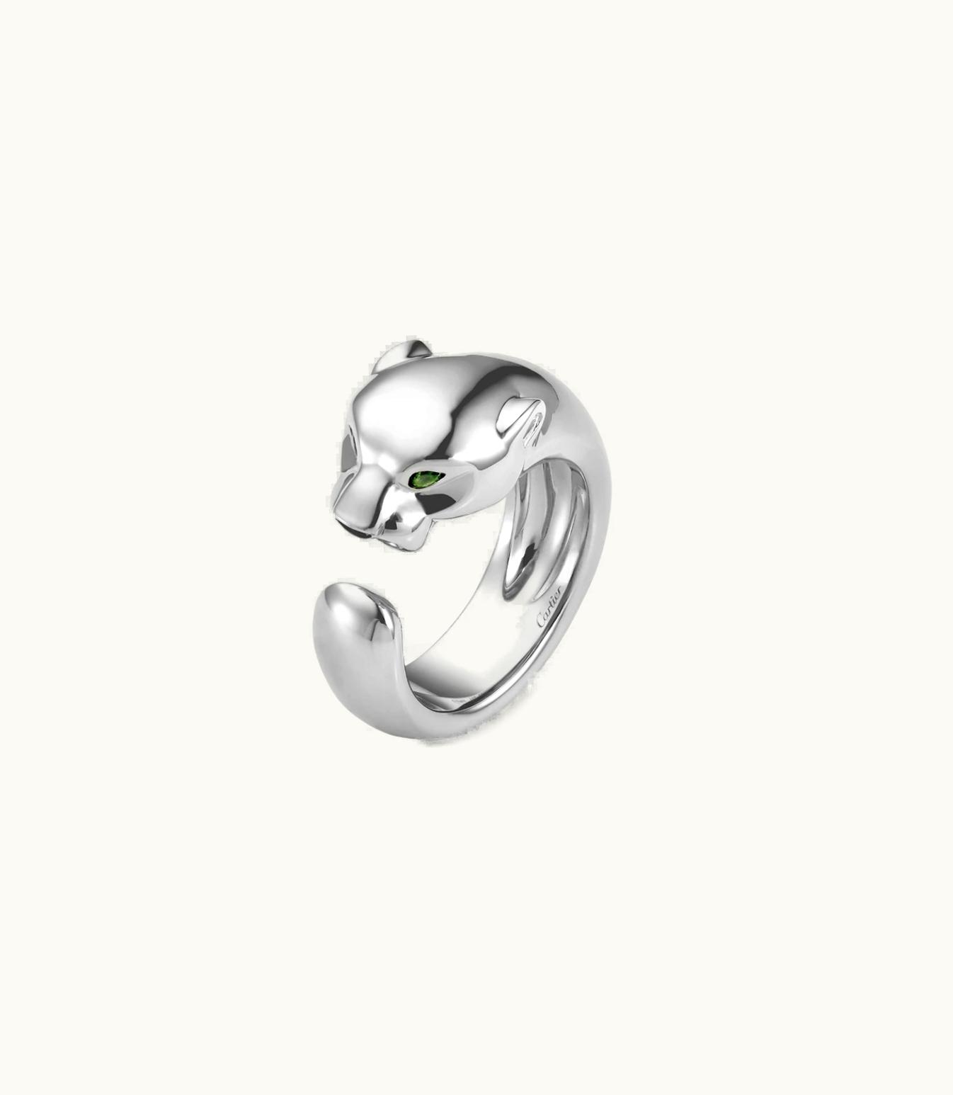 The exquisite Panthère de Cartier ring is crafted from premium white gold 750/1000 and adorned with stunning tsavorite garnets and onyx. Measuring 11mm in width for size 52, please be advised that carat weight, the quantity of stones, and overall product dimensions will be subject to variation based on the size of the piece ordered. If you require more detailed information, do not hesitate to contact us for assistance.