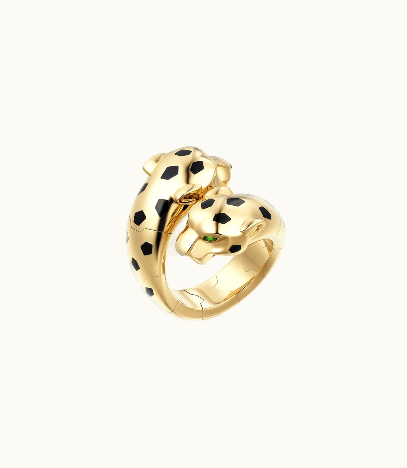 This exquisite Panthère de Cartier ring is crafted from 750/1000 yellow gold and features a striking combination of onyx and black lacquer. Adorned with four sparkling tsavorite garnets, this ring is available in size 52, though carat weight, stone count, and overall dimensions may differ depending on the size selected. For further details, we welcome you to get in touch with us.