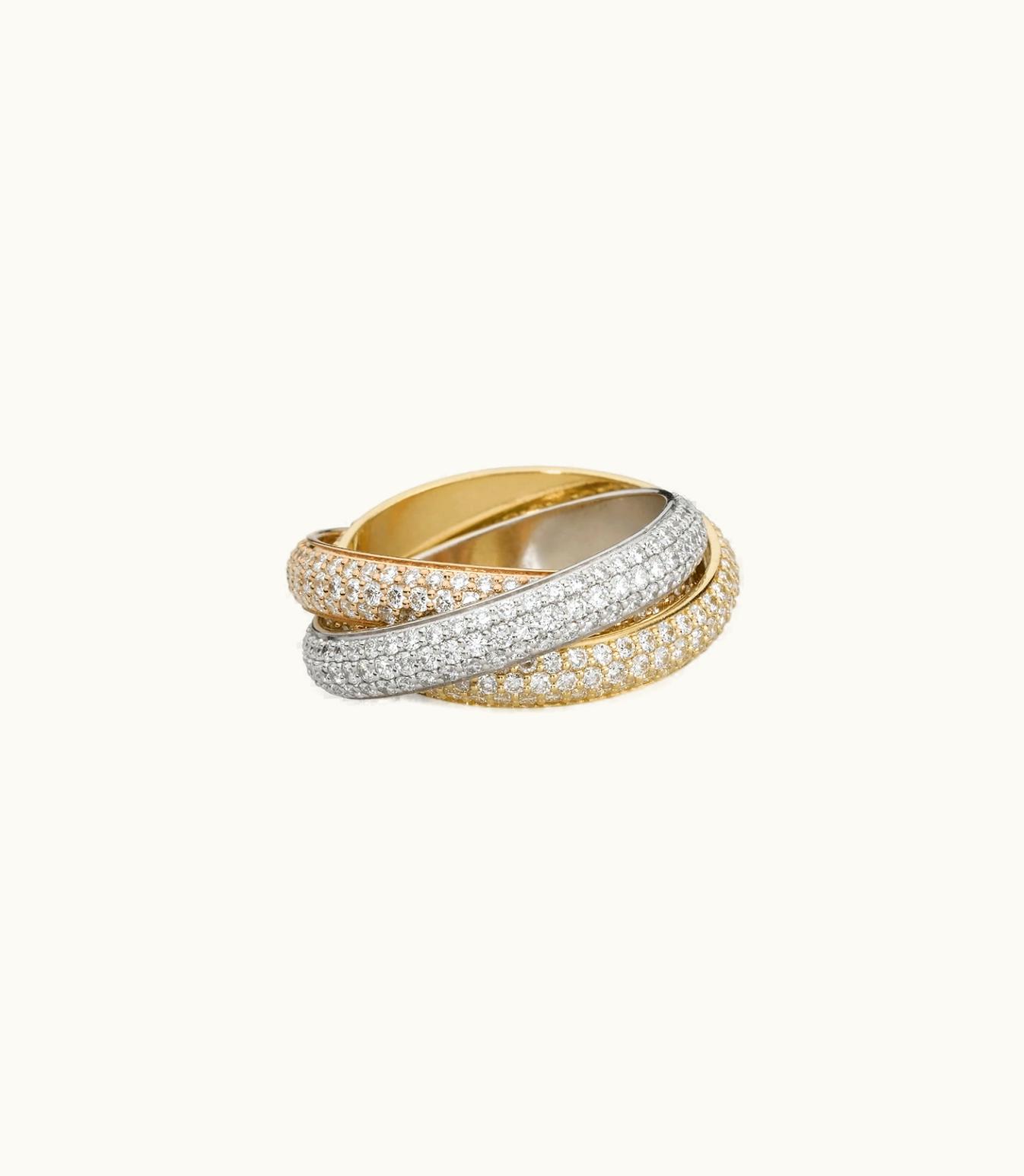 This gorgeous Trinity ring in a medium size is composed of high-quality white gold (750/1000), rose gold (750/1000), and yellow gold (750/1000). It is adorned with a stunning total of 432 brilliant-cut diamonds, which amount to 2.98 carats in weight (for size 52). Please bear in mind that the dimensions, carat weight, and number of stones may differ depending on the size you order. For comprehensive information, kindly get in touch with us.